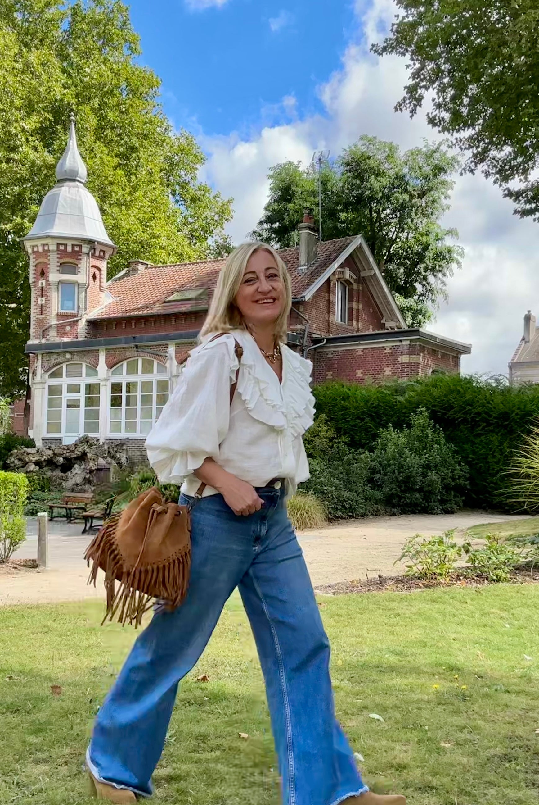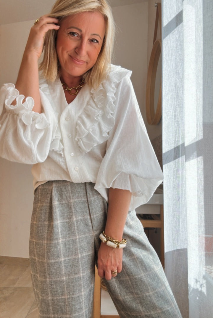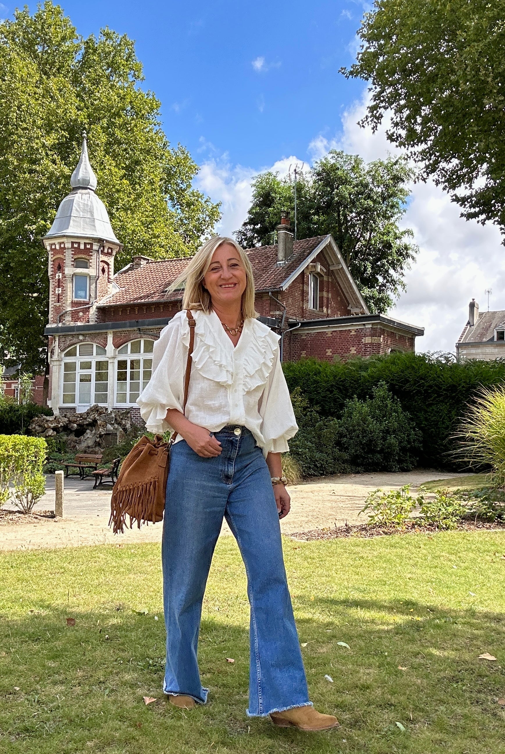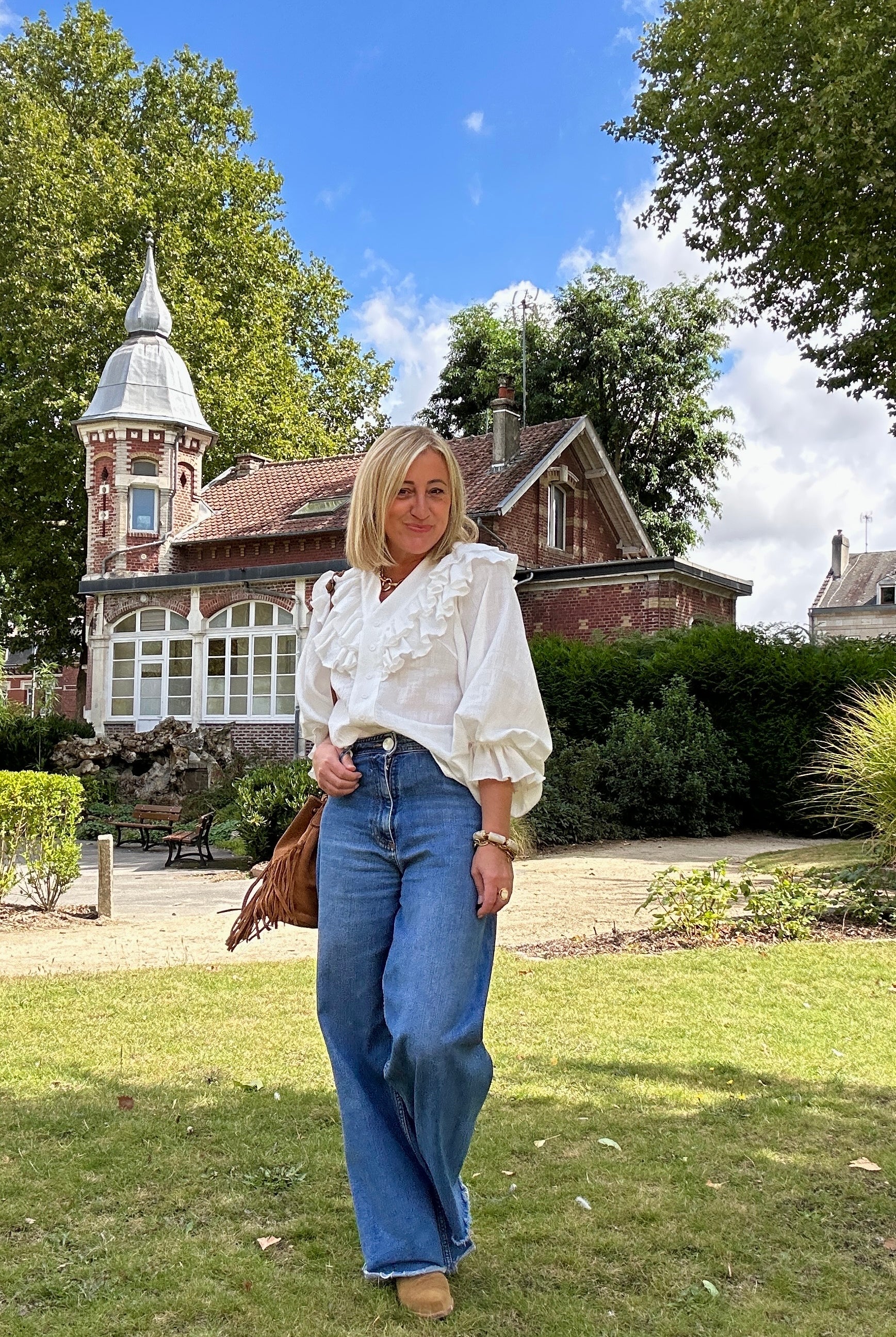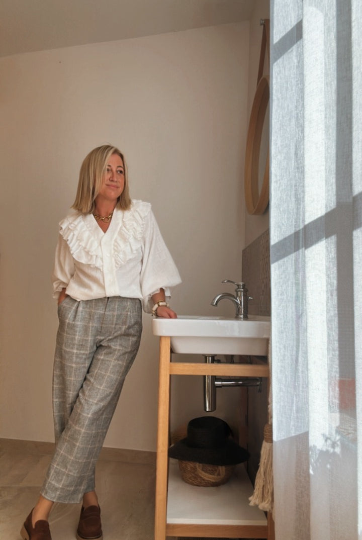 "J'aime porter le pantalon GREJ en toute circonstance, il a un effet autant élégant que décontracté.Le chemisier MADEMOISELLE, l'effet loose, apporte un confort ultime, et j'aime plus particulièrement la porter ouverte, avec un petit top en dessous, pour un effet chemise/gilet, qui apporte une touche de modernité."