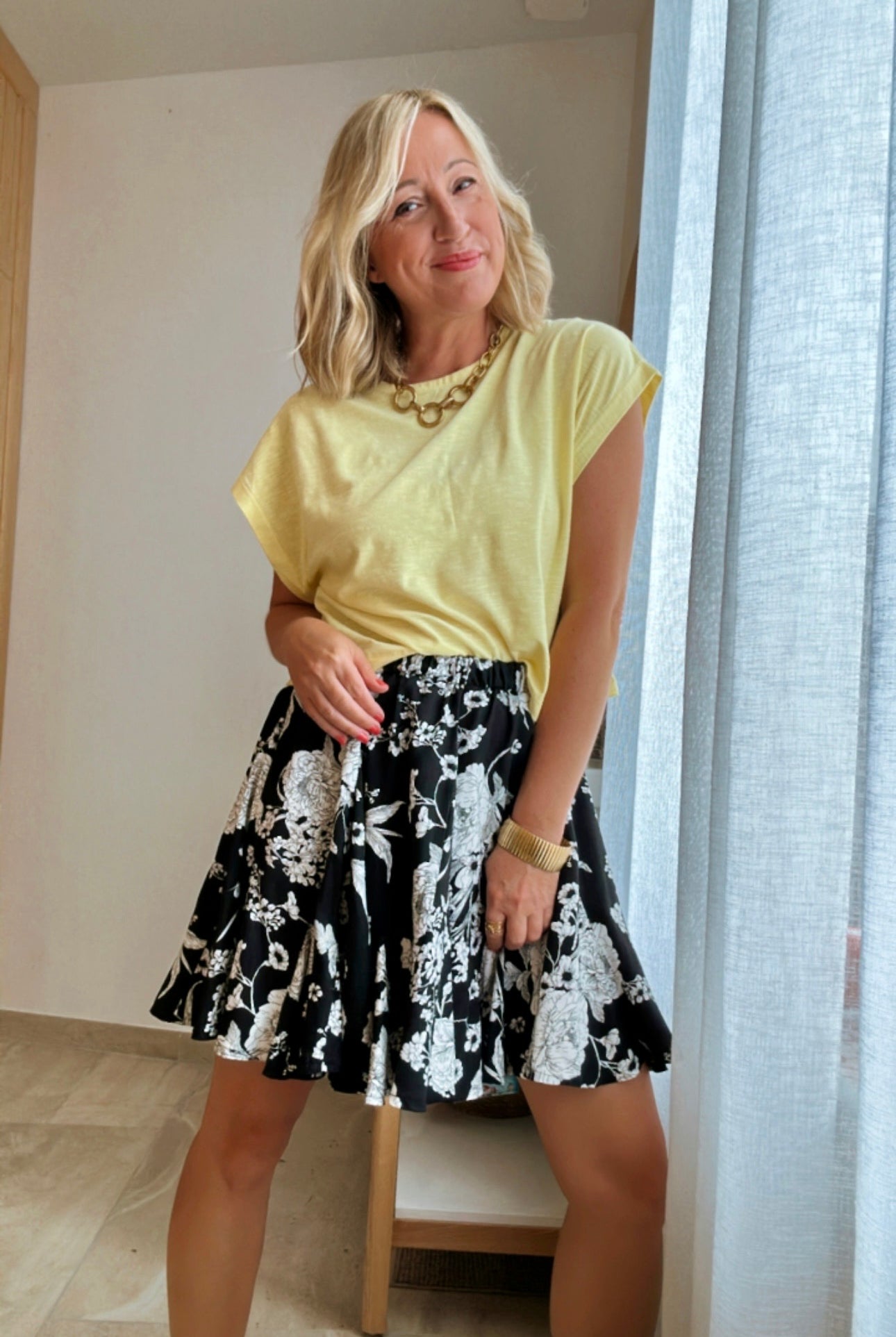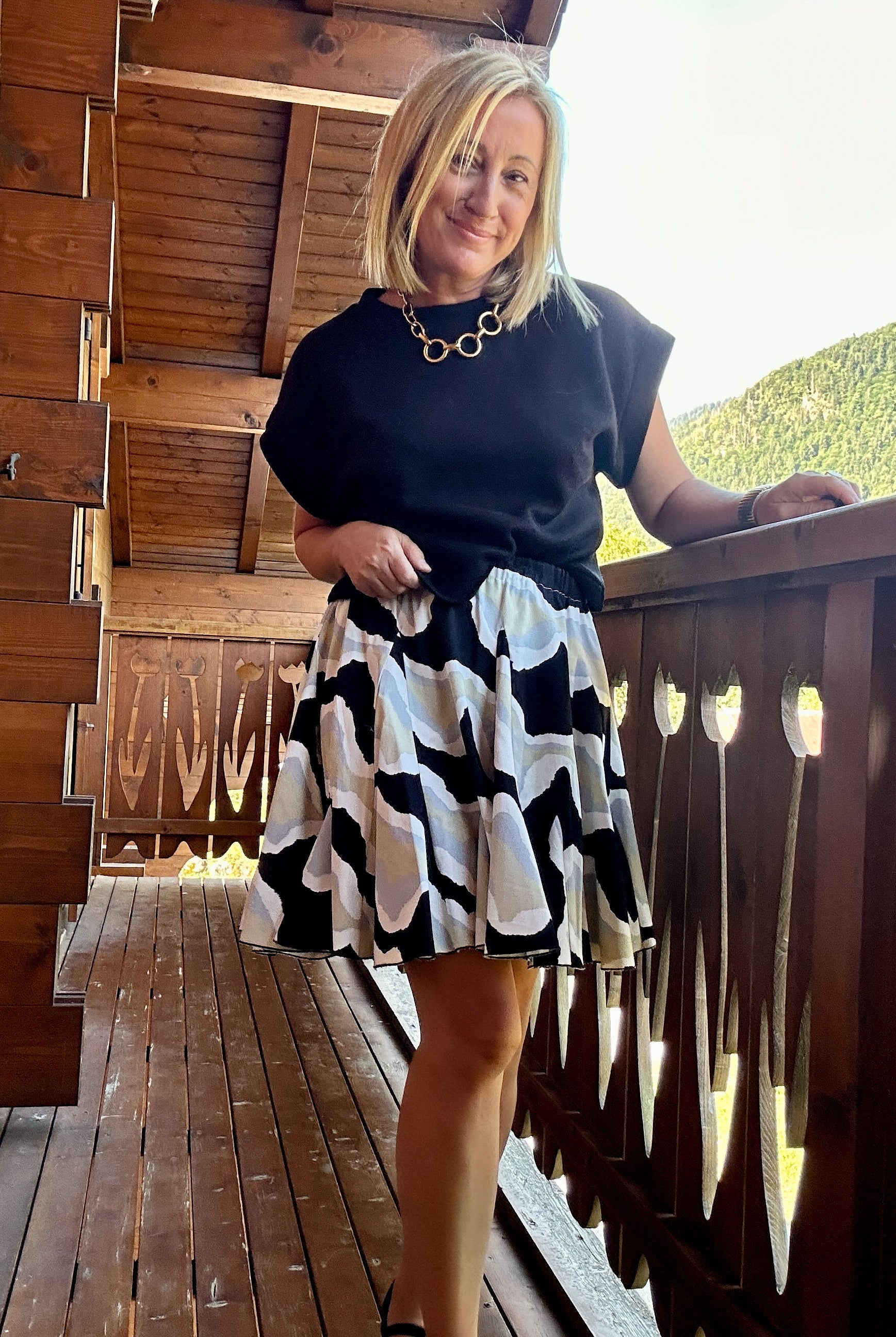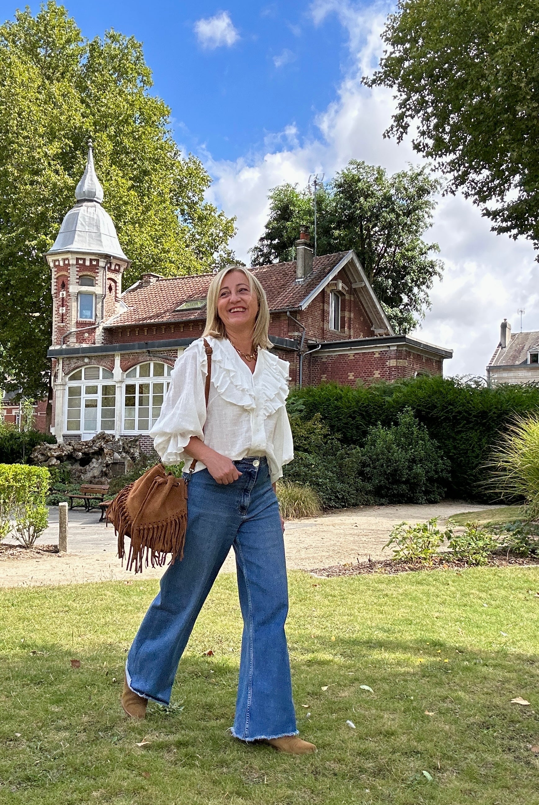 "J'ai beaucoup aimé coudre ces deux pièces qui forment un duo parfait. Le pantalon GREJ tombe parfaitement bien. En plus d'être chic, il est très confortable. Je suis fan de cette coupe style jupe-culotte et de ses larges revers. J'ai l'impression de porter un pantalon de haute couture. Je n'ai rencontré aucune difficulté, il est très agréable à coudre. Quant au chemisier MADEMOISELLE, j'adore sa coupe oversize, elle tombe impeccablement bien, est facile à coudre et très agréable à porter."