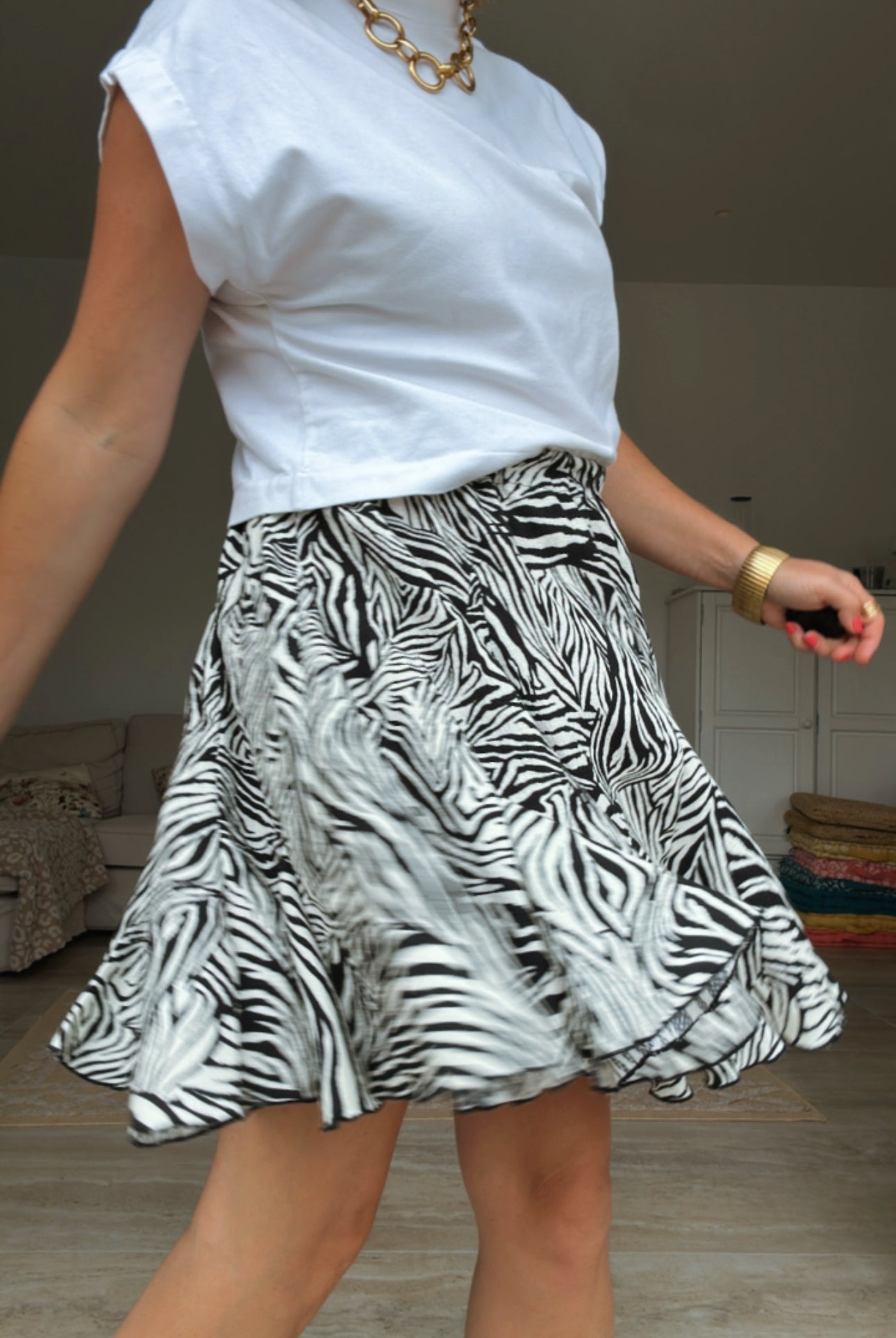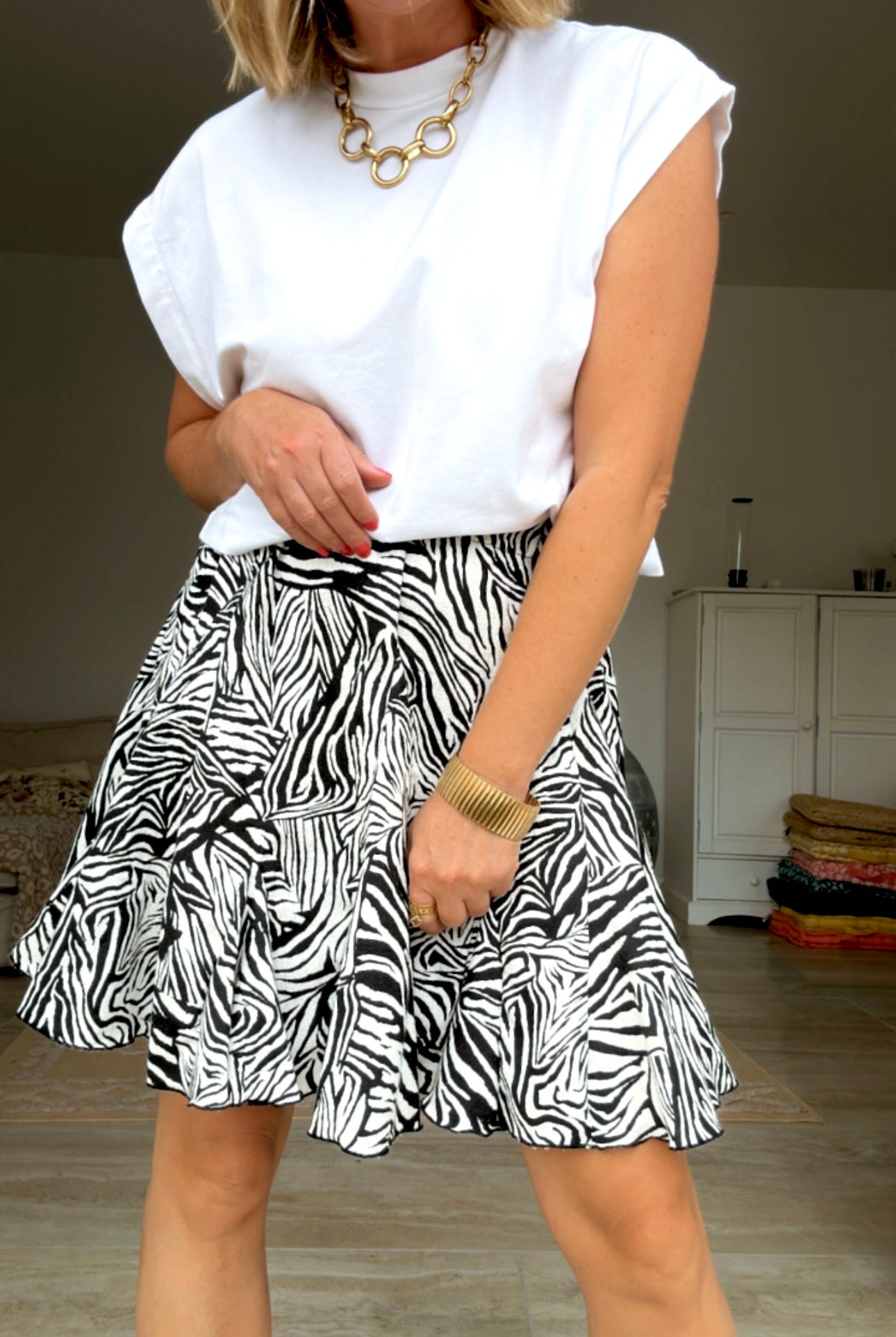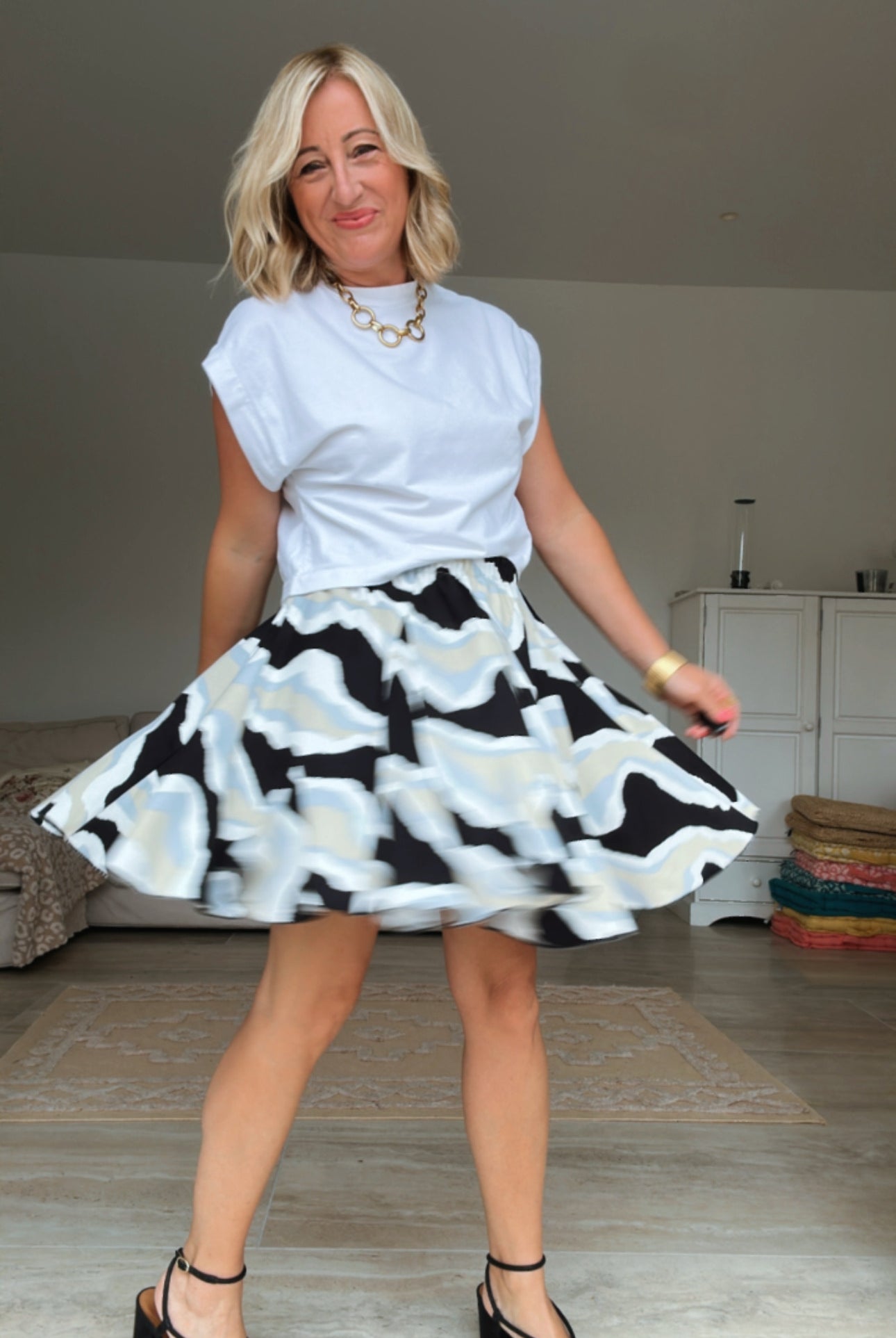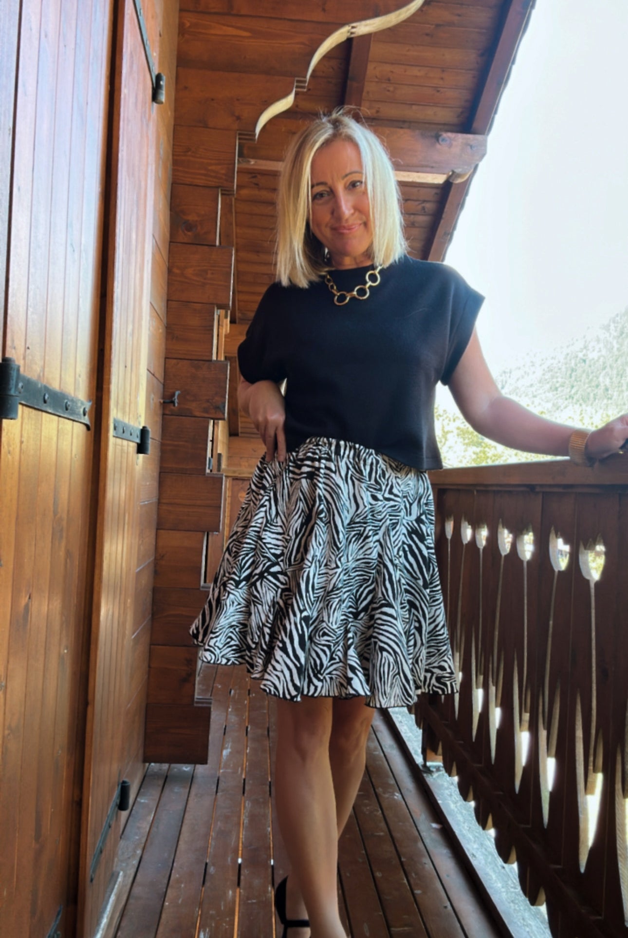 "J'ai beaucoup aimé coudre ces deux pièces qui forment un duo parfait. Le pantalon GREJ tombe parfaitement bien. En plus d'être chic, il est très confortable. Je suis fan de cette coupe style jupe-culotte et de ses larges revers. J'ai l'impression de porter un pantalon de haute couture. Je n'ai rencontré aucune difficulté, il est très agréable à coudre. Quant au chemisier MADEMOISELLE, j'adore sa coupe oversize, elle tombe impeccablement bien, est facile à coudre et très agréable à porter."