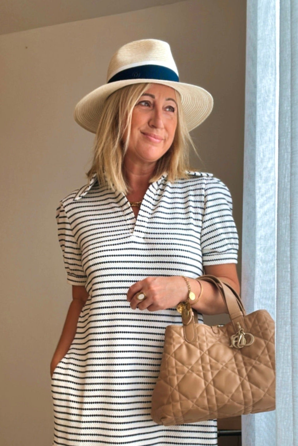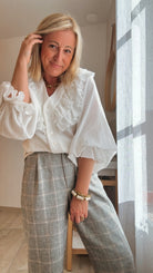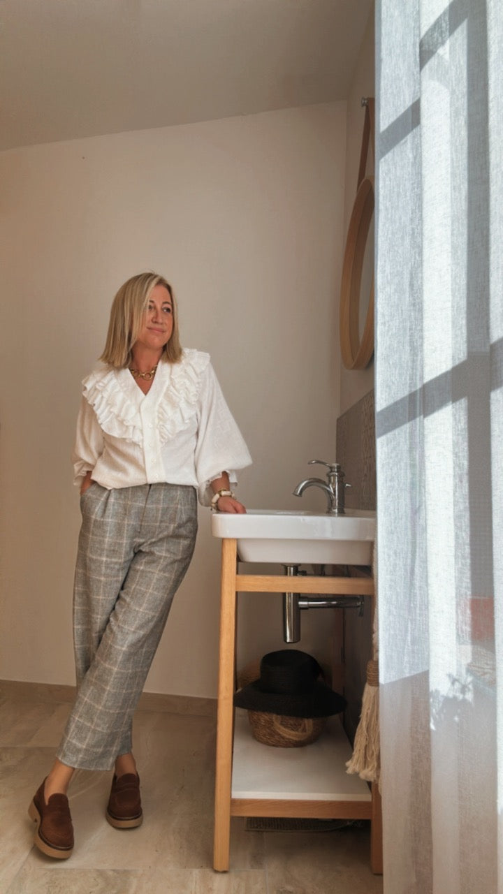 Estelle mesure 1m60, tour de taille 72 cm, tour de bassin 92 cm et porte le pantalon LAZAZO en taille 36 pour son 34/36 du vêtement en prêt-à-porter du commerce.