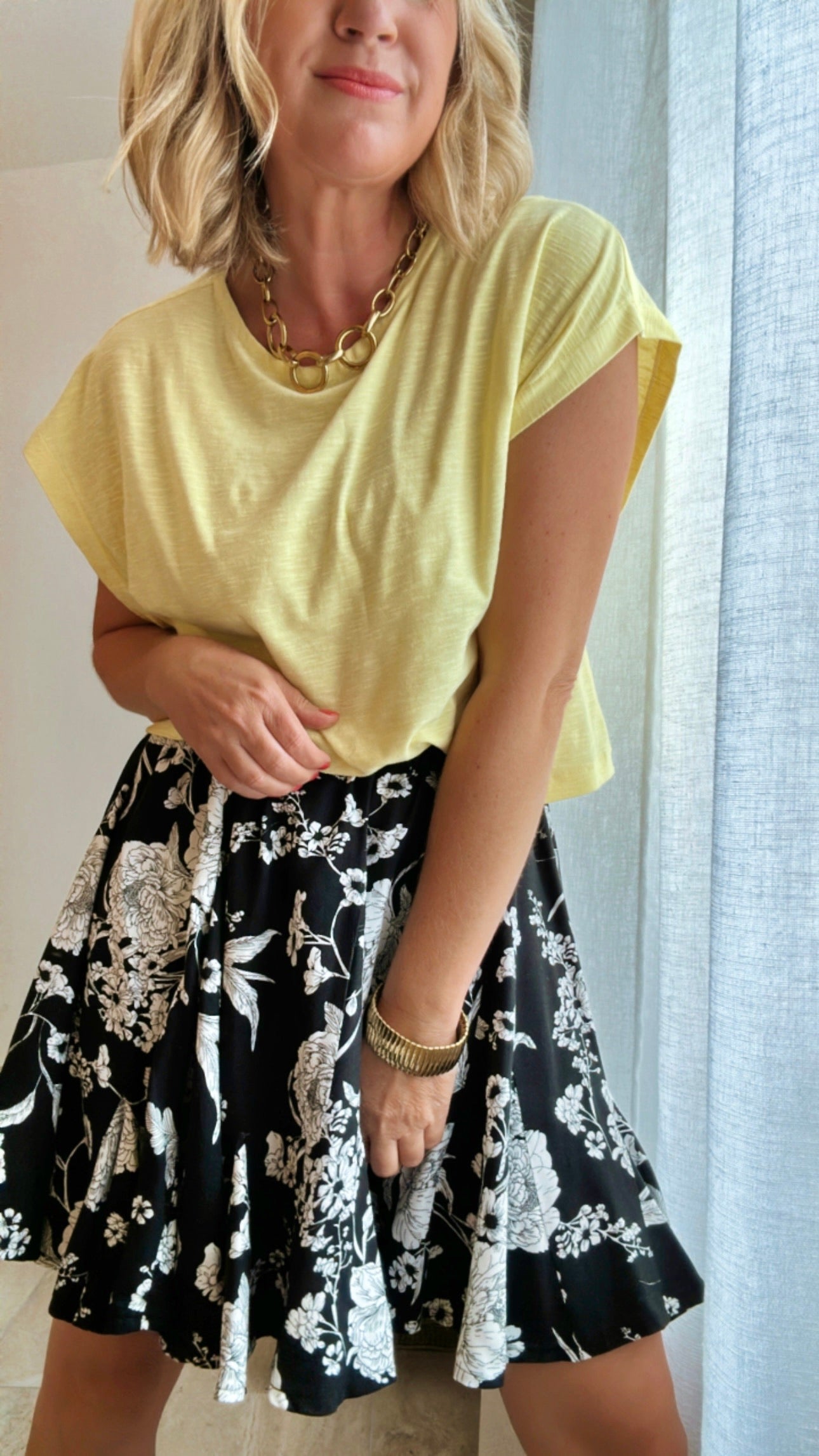 Estelle mesure 1m60 et porte la jupe EMILIE en taille 36 pour son 34/36 du vêtement en prêt-à-porter du commerce.