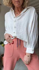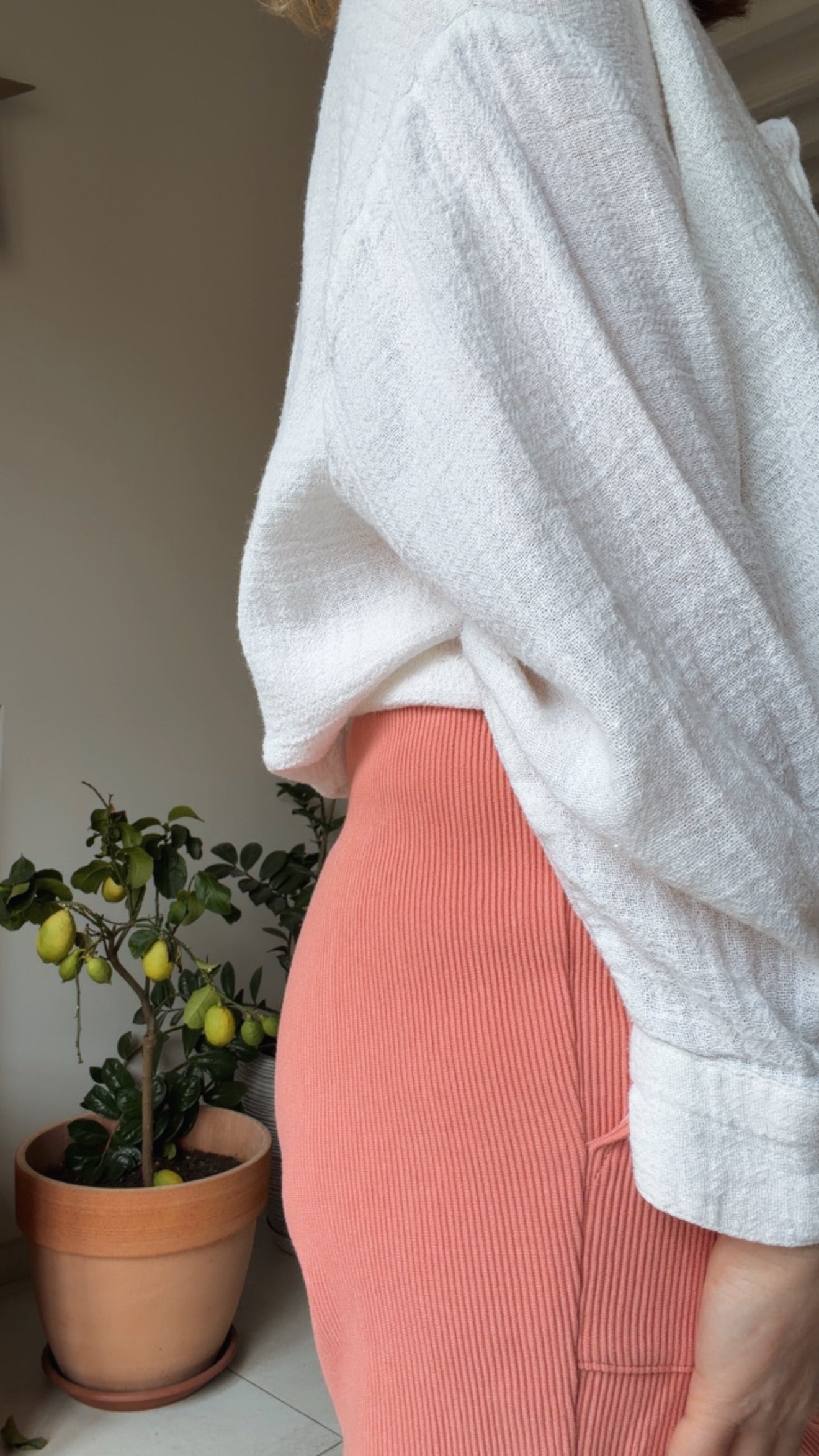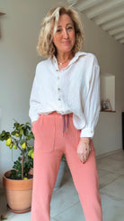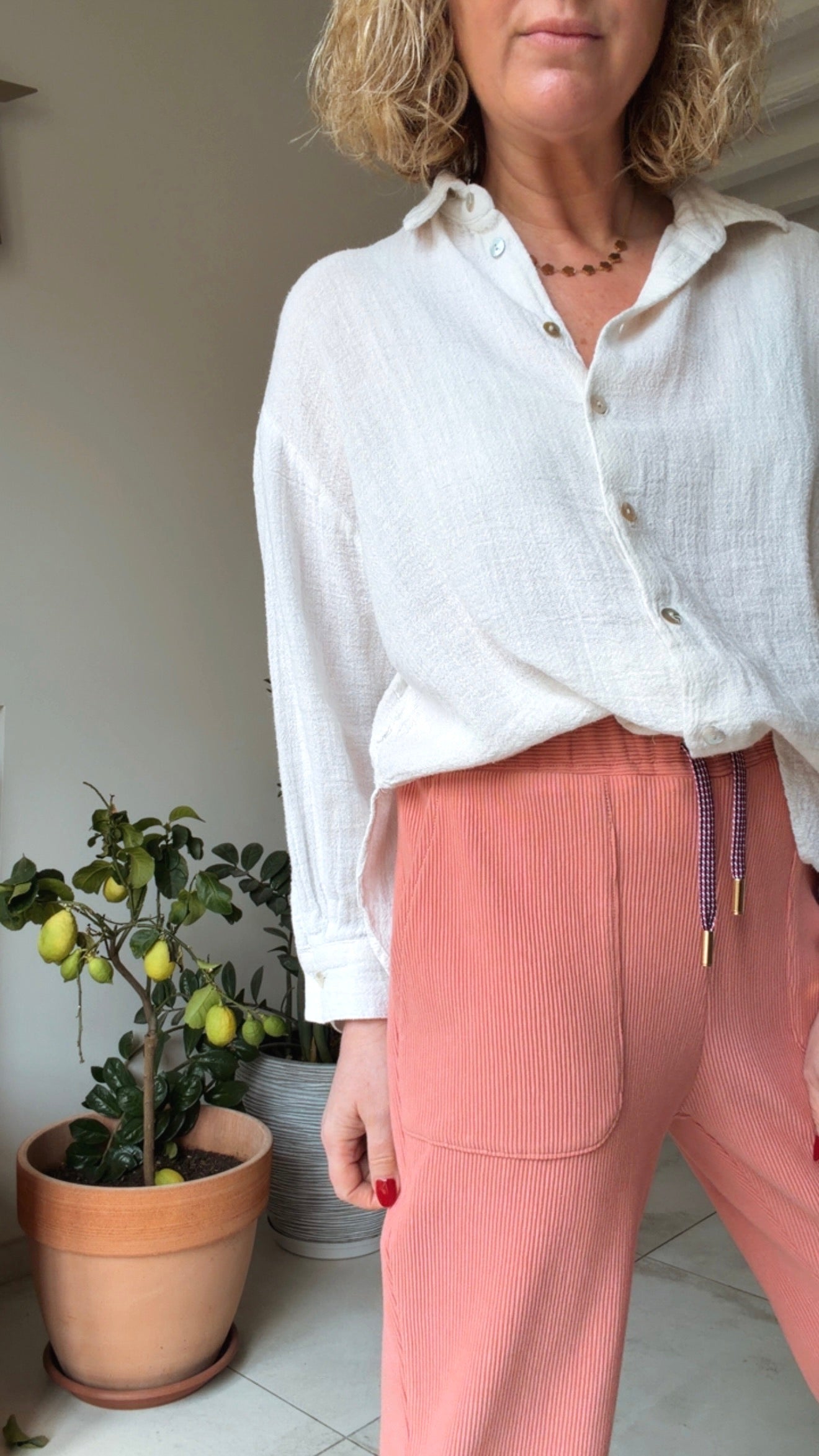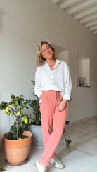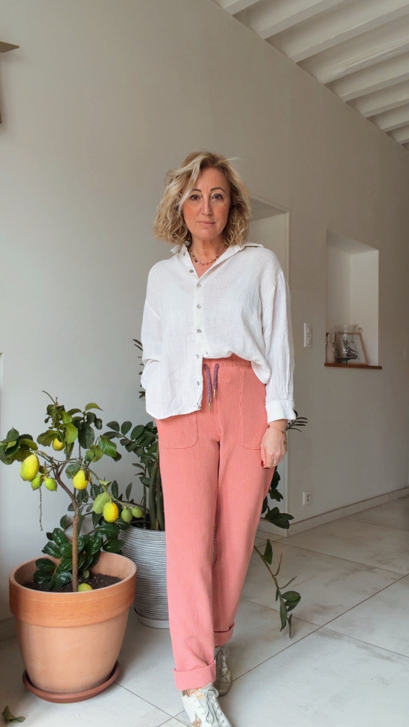 Estelle mesure 1m60 et porte le pantalon LINO en taille 36 pour son 34/36 du vêtement en prêt-à-porter du commerce.