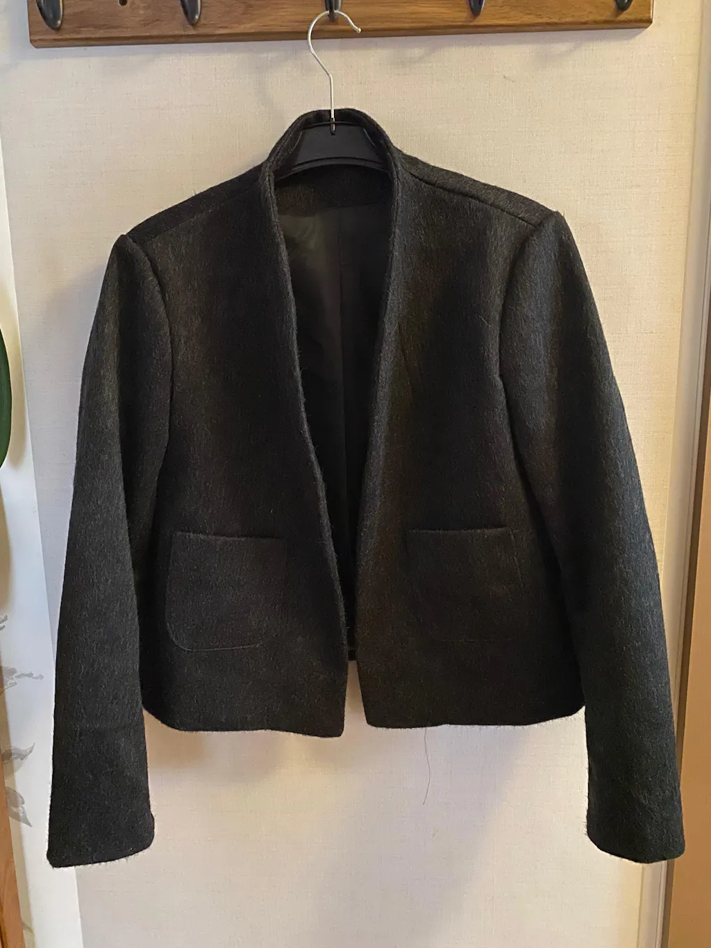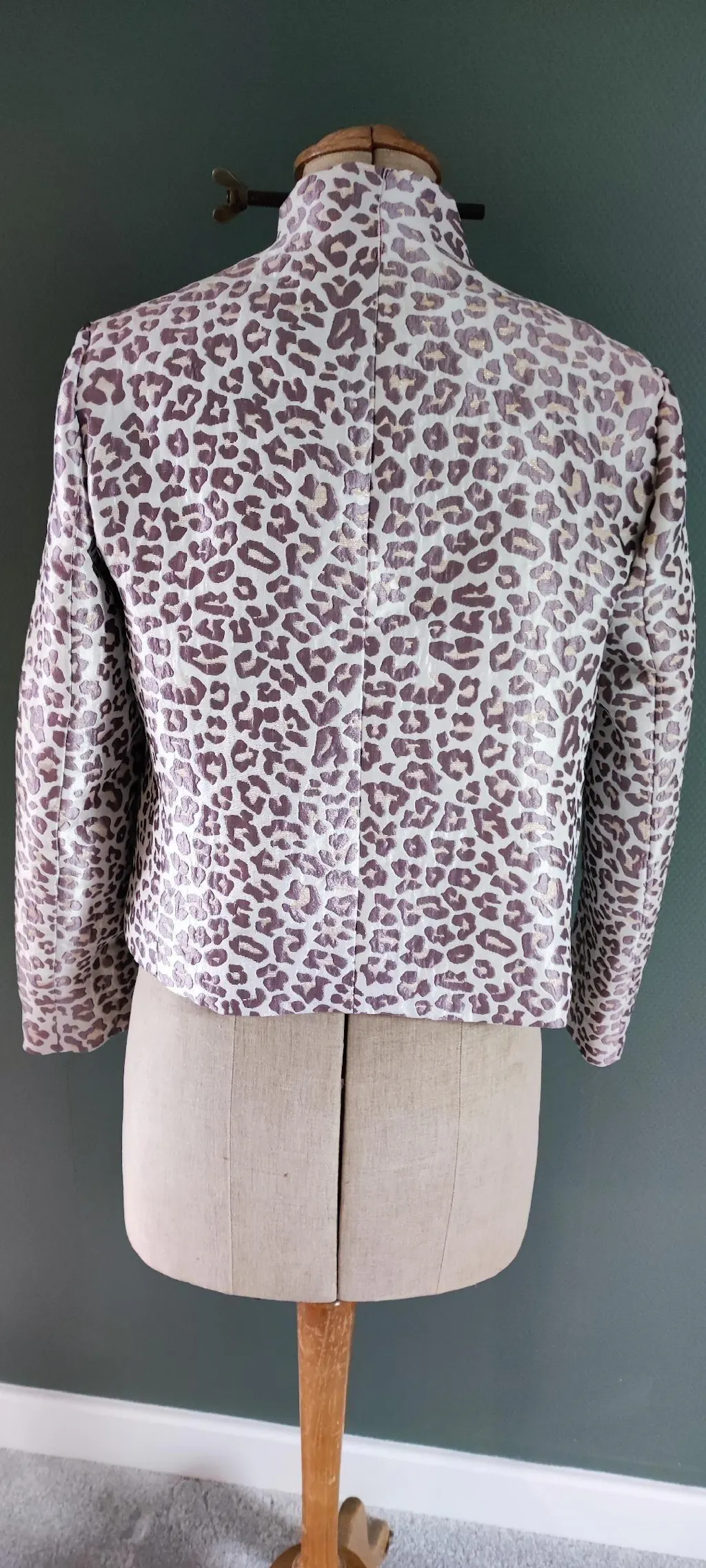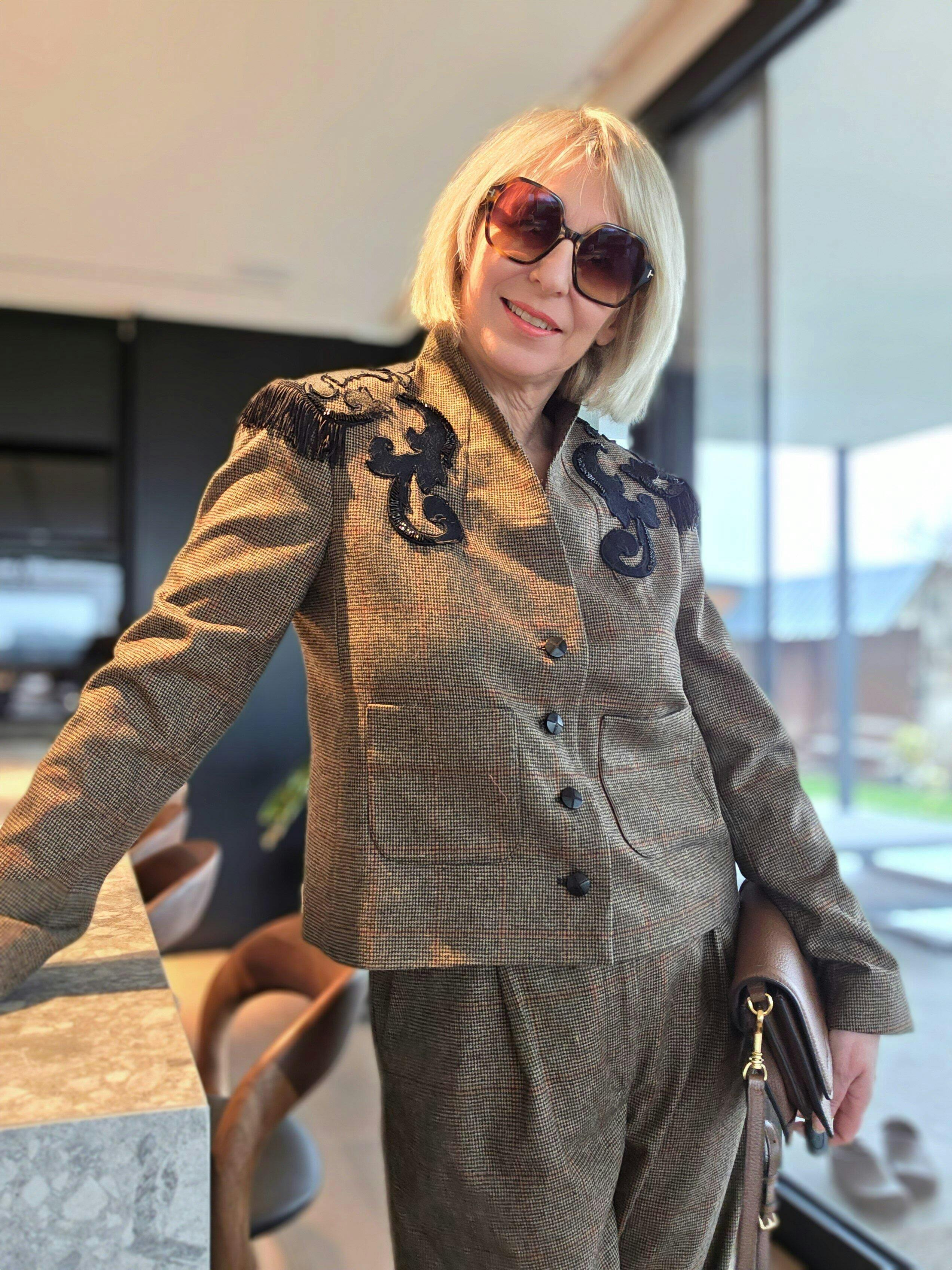 Estelle mesure 1m60 et porte la veste CHLOÉ en taille 36 pour son 34/36 du vêtement en prêt-à-porter du commerce.