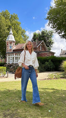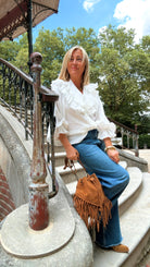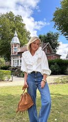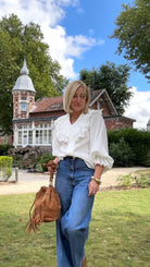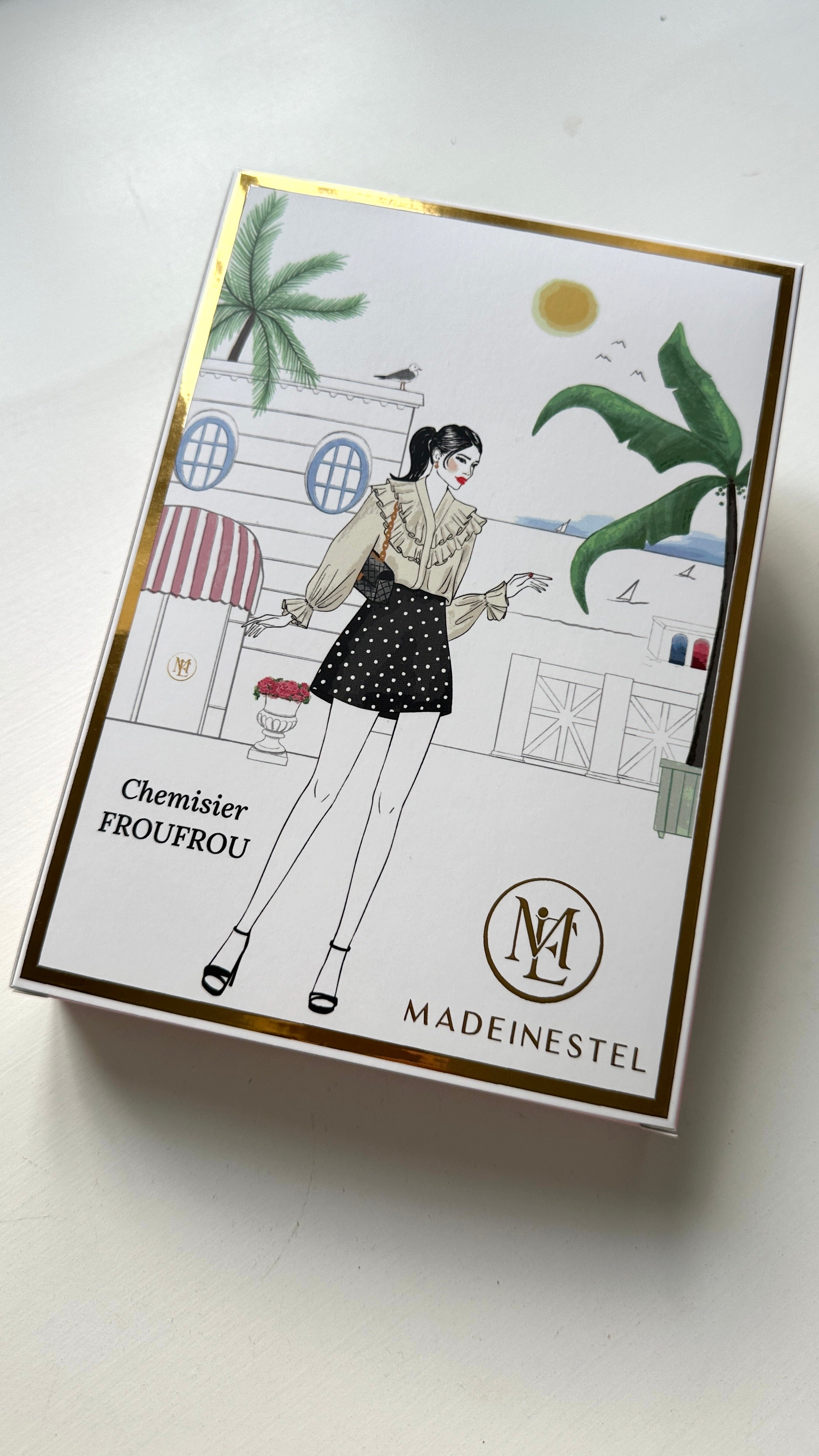 FROUFROU est un chemisier à encolure en V, soulignée par deux rangées de volants généreux. Il incarne le classique revisité, avec une touche bohème chic pleinement assumée.