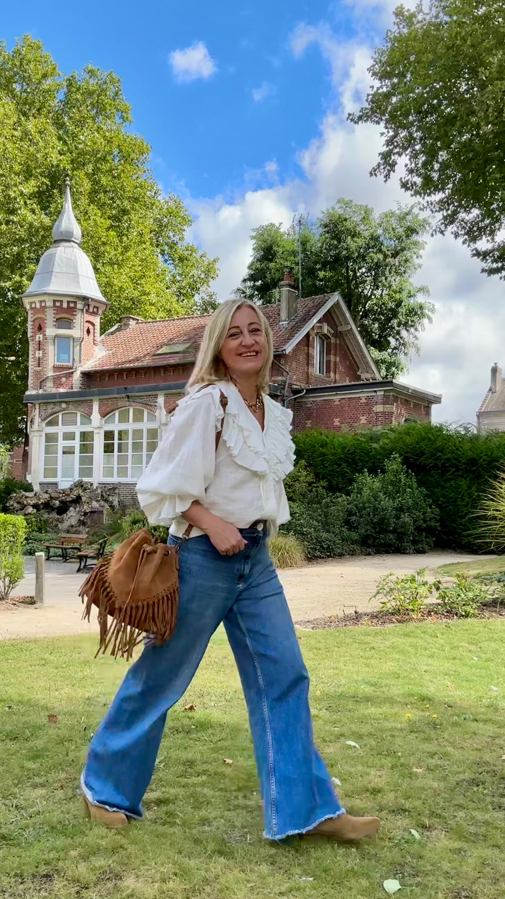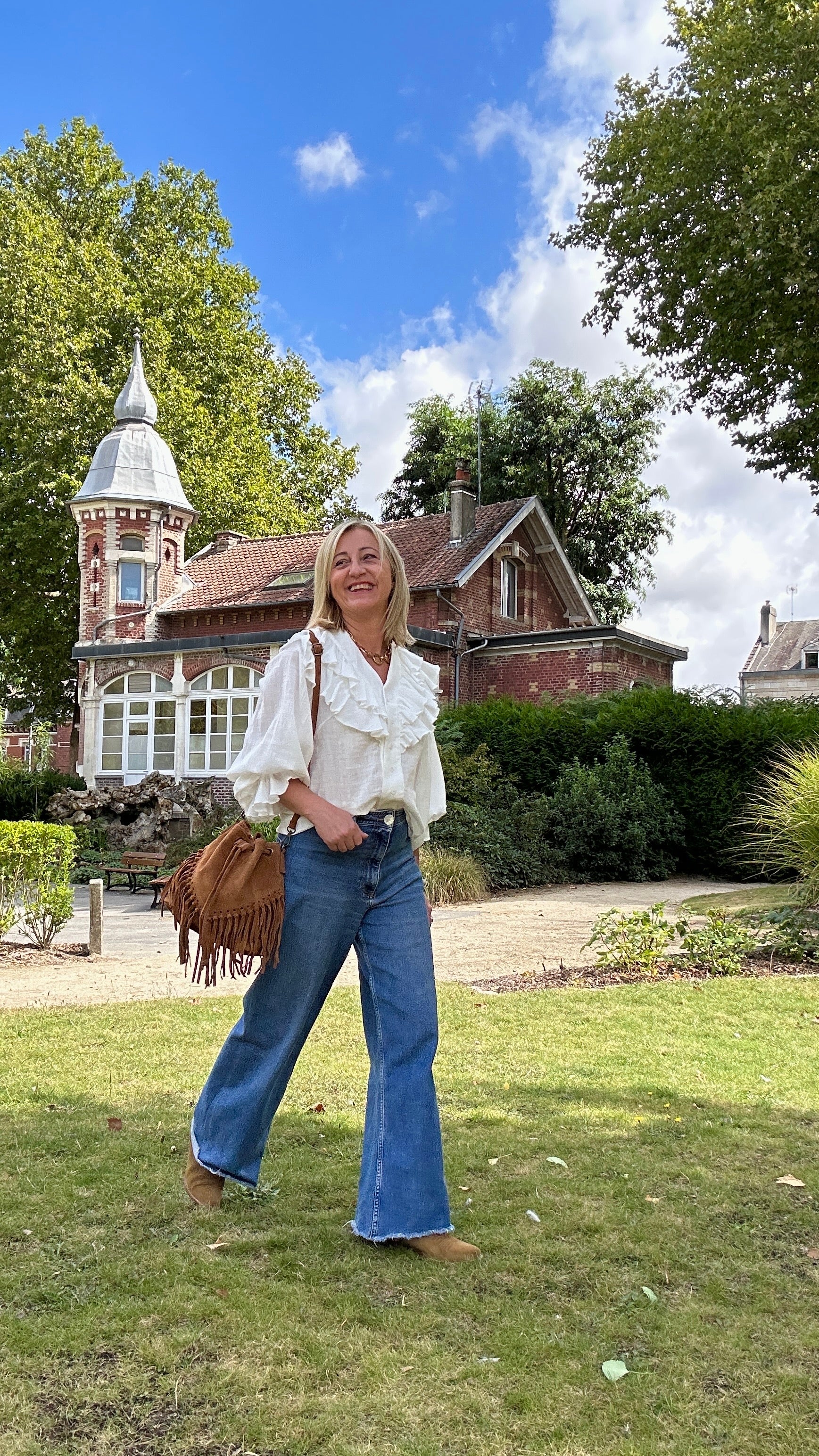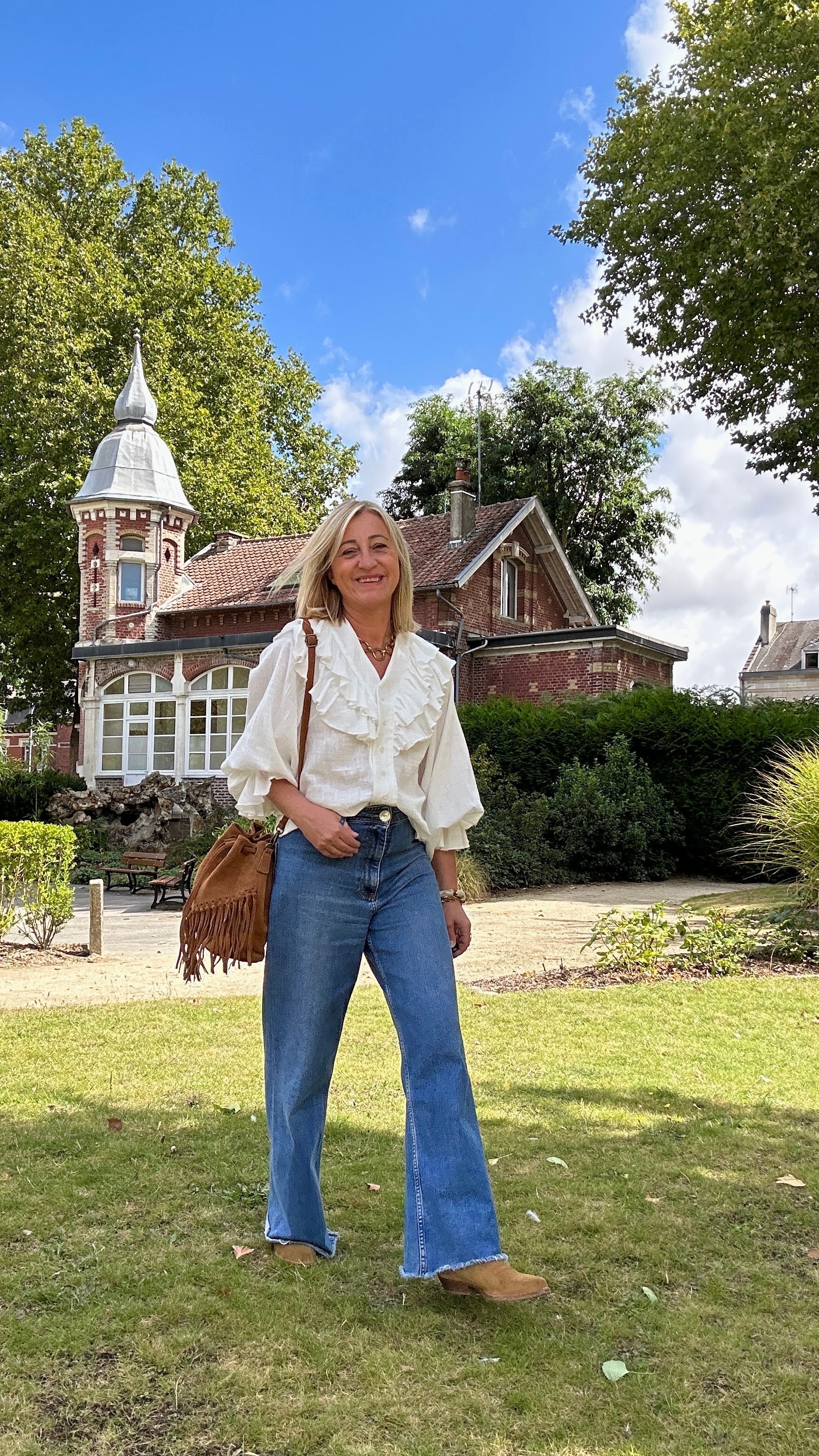 Estelle mesure 1m60 et porte le chemisier FROUFROU en taille 36 pour son 36 du vêtement en prêt-à-porter du commerce. Son tour de poitrine est de 90.