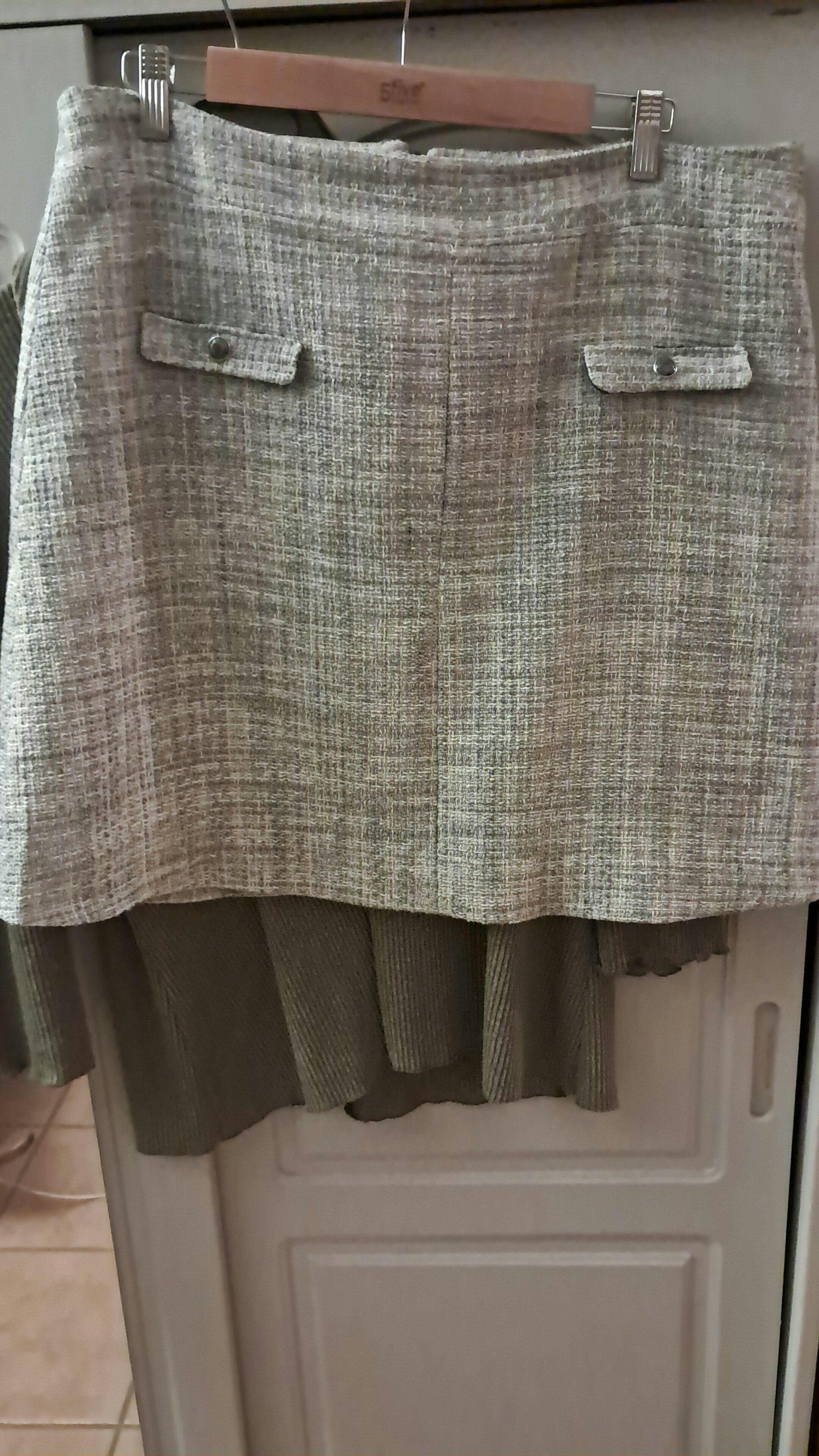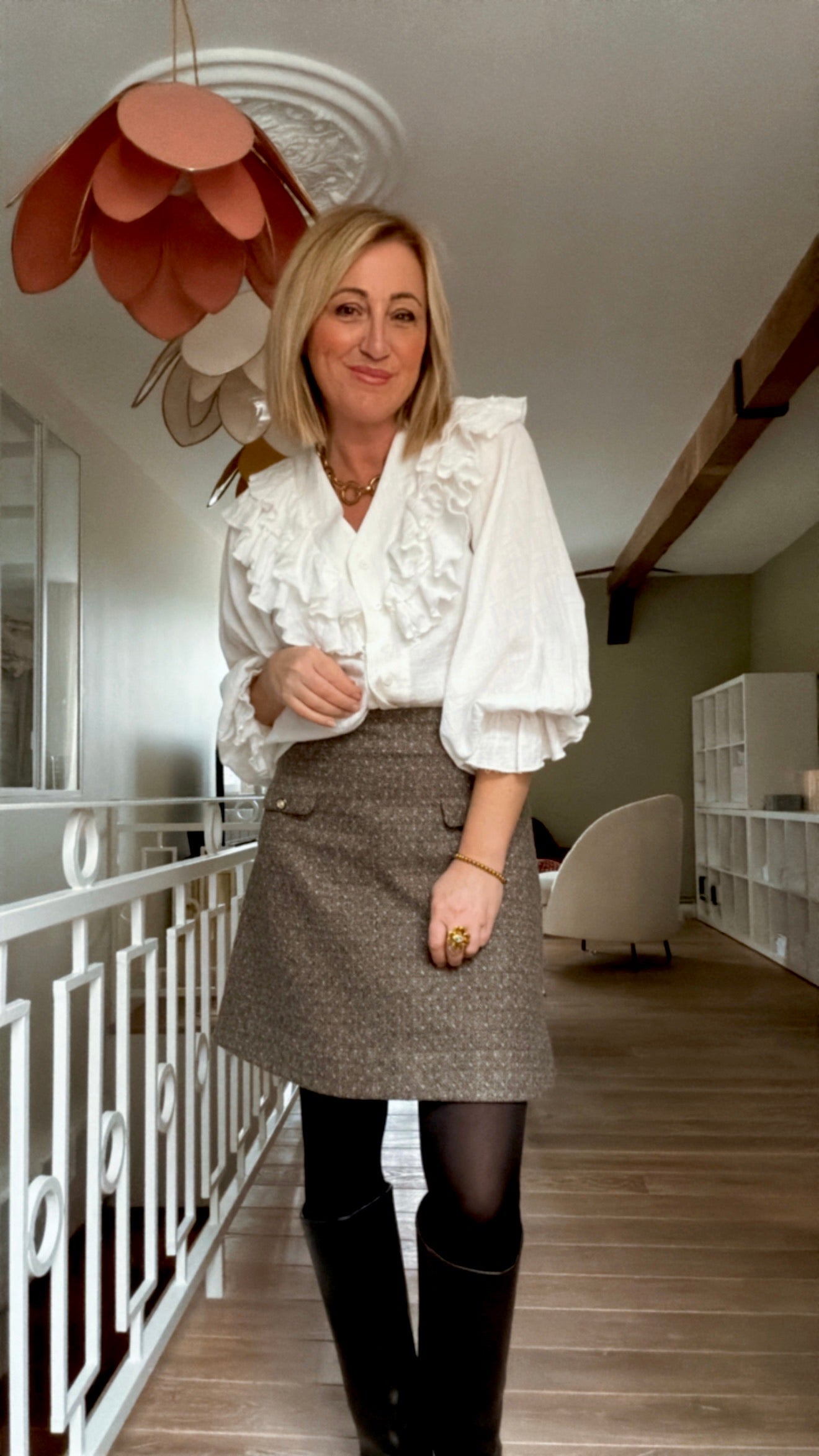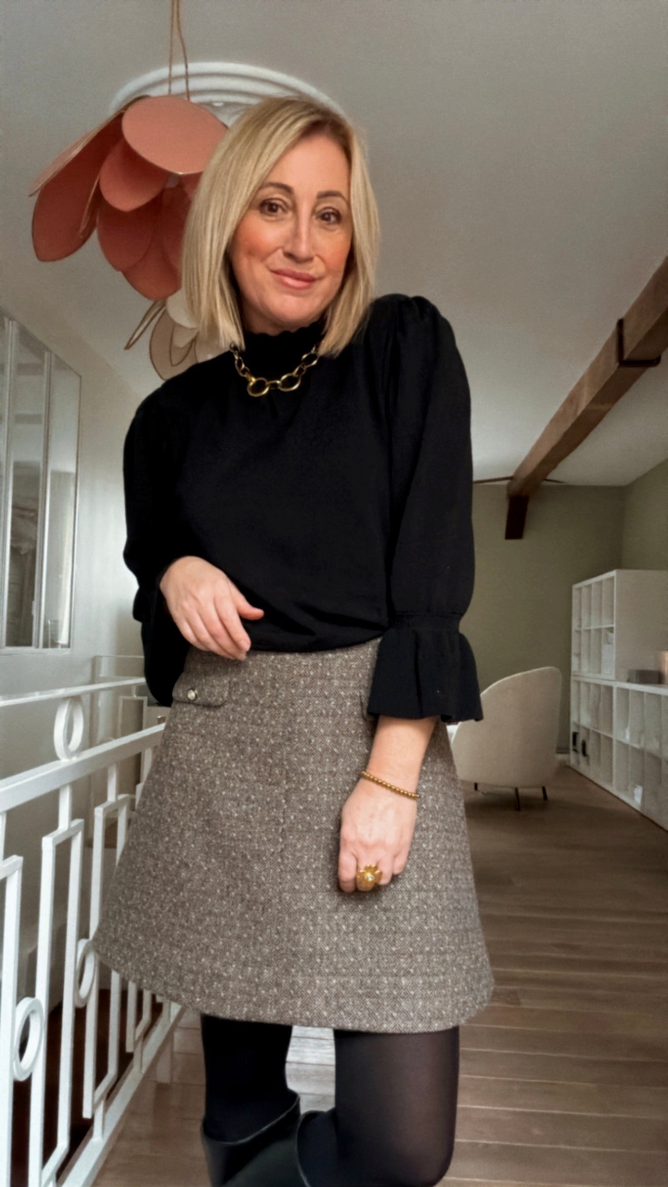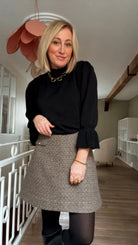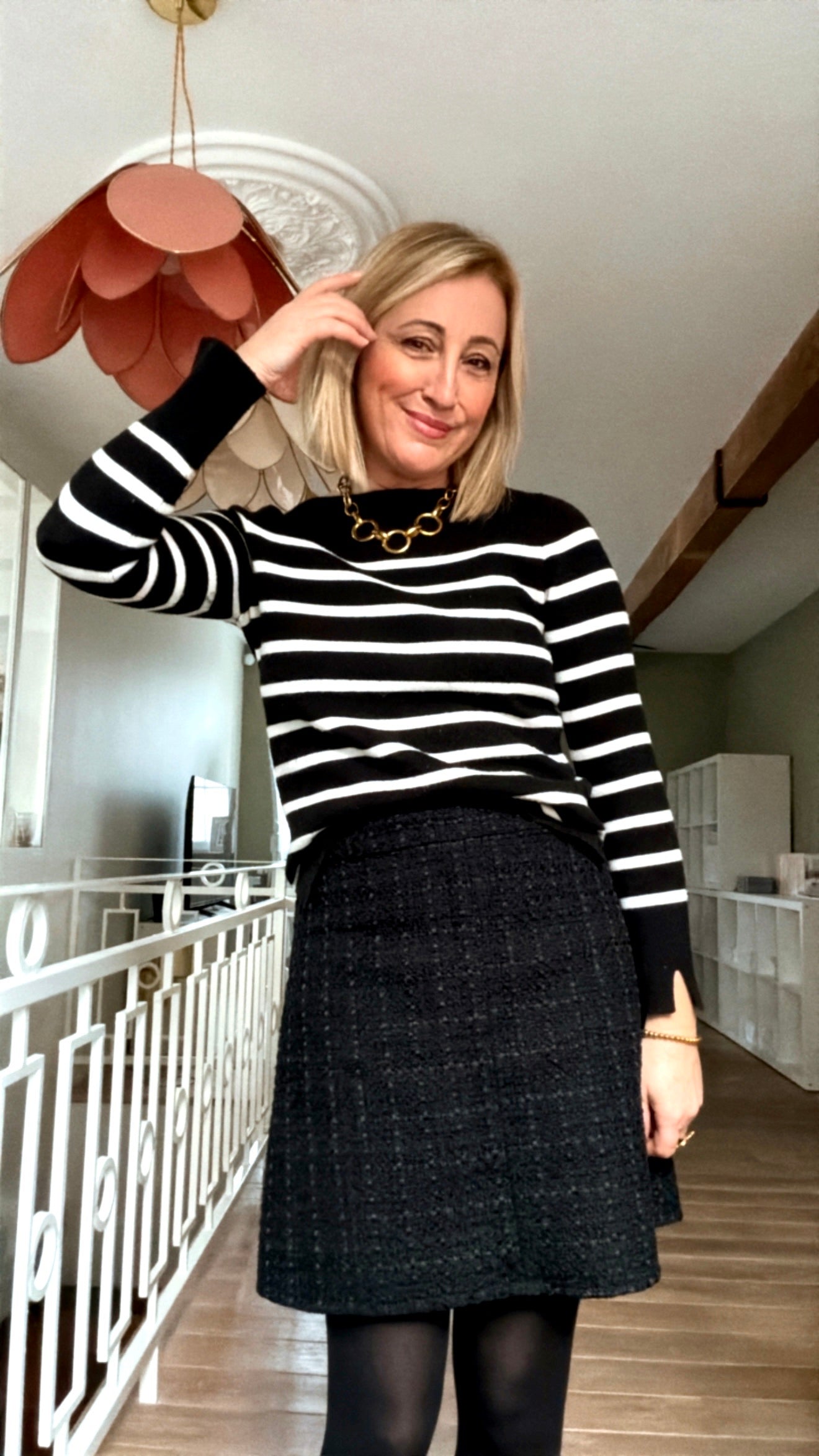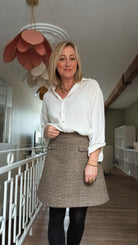 Estelle mesure 1m60 et porte la jupe MONICA en taille 36 pour son 34/36 du vêtement en prêt-à-porter du commerce.