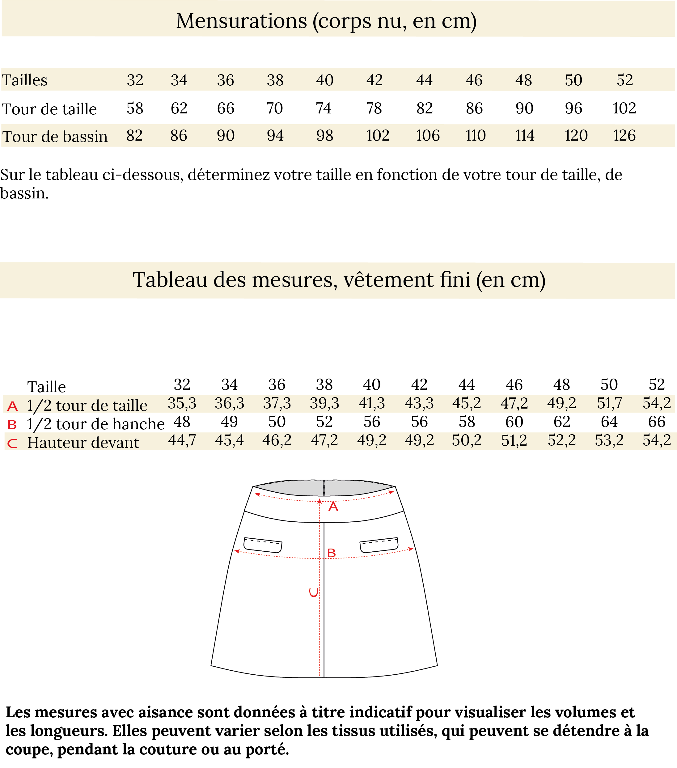 Le patron de couture de la jupe MONICA est proposé de la taille 32 à 52 pour une stature de 1m65.