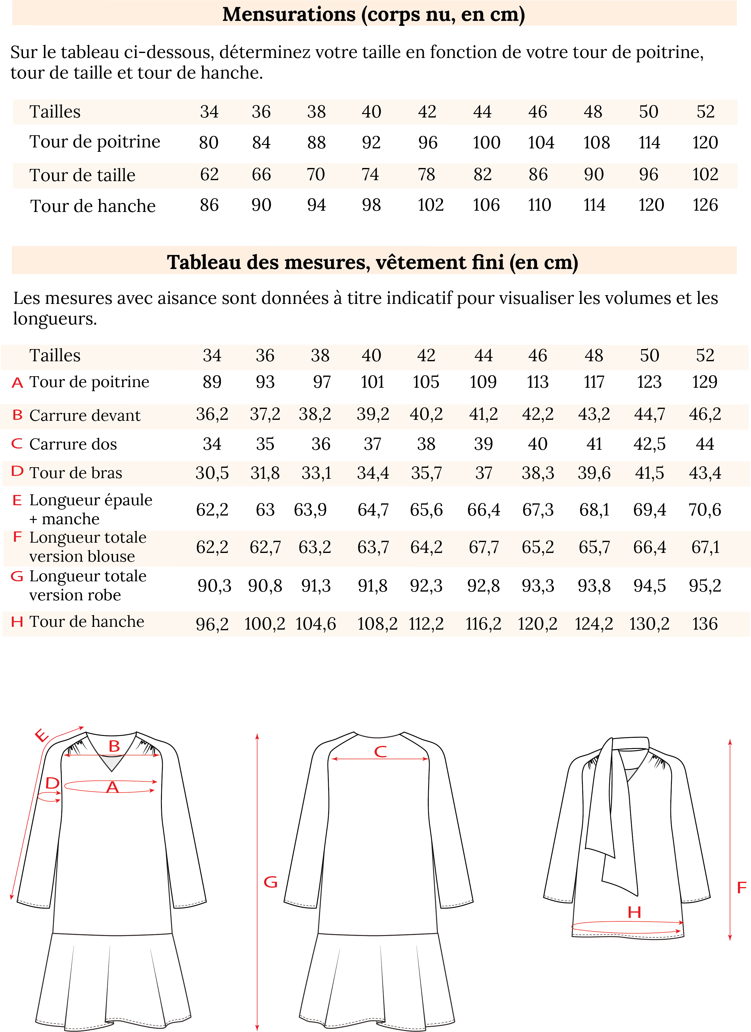 Le patron de couture de la robe / blouse est proposé de la taille 34 à 52 pour une stature de 1m65.