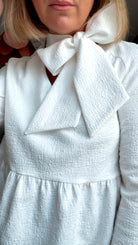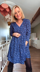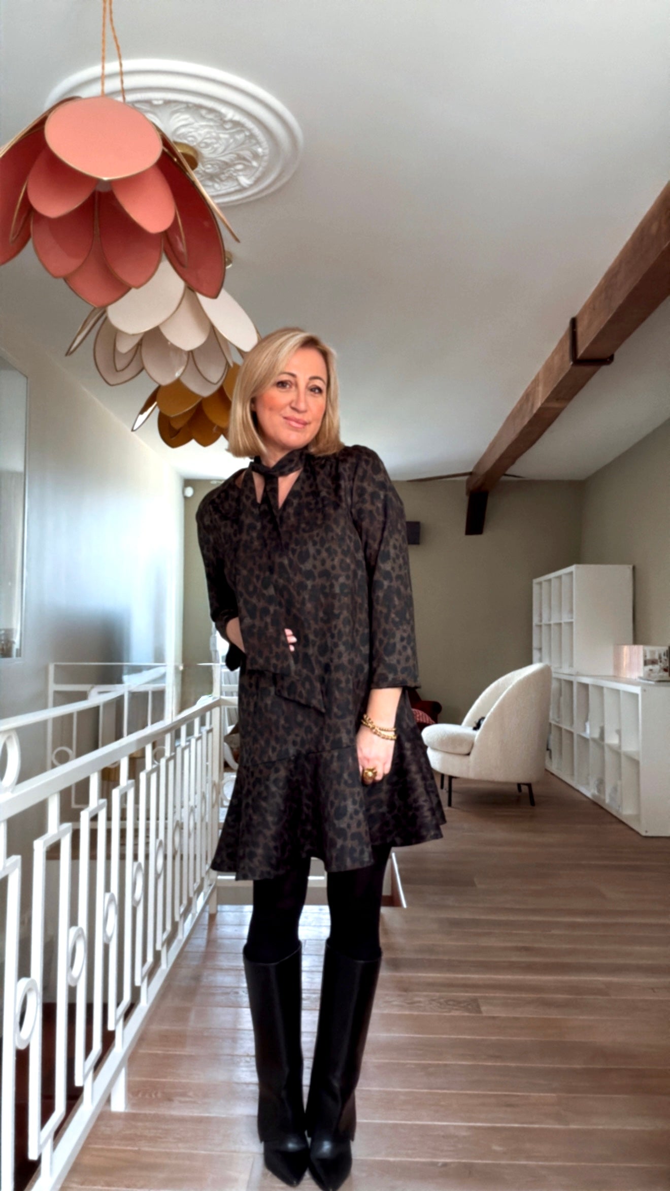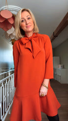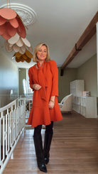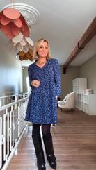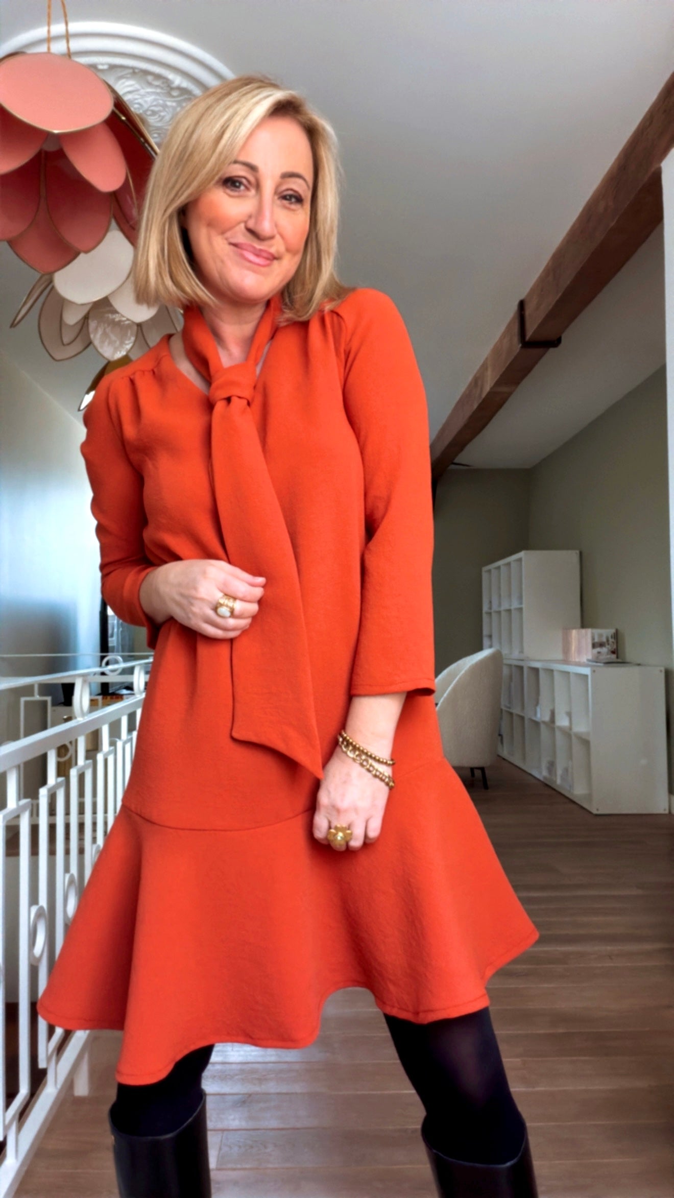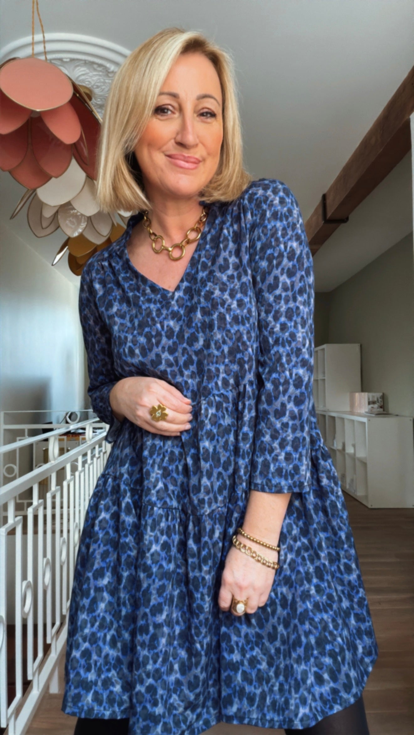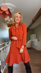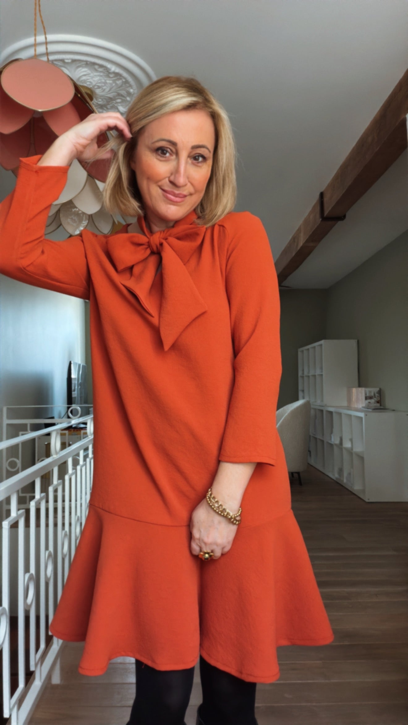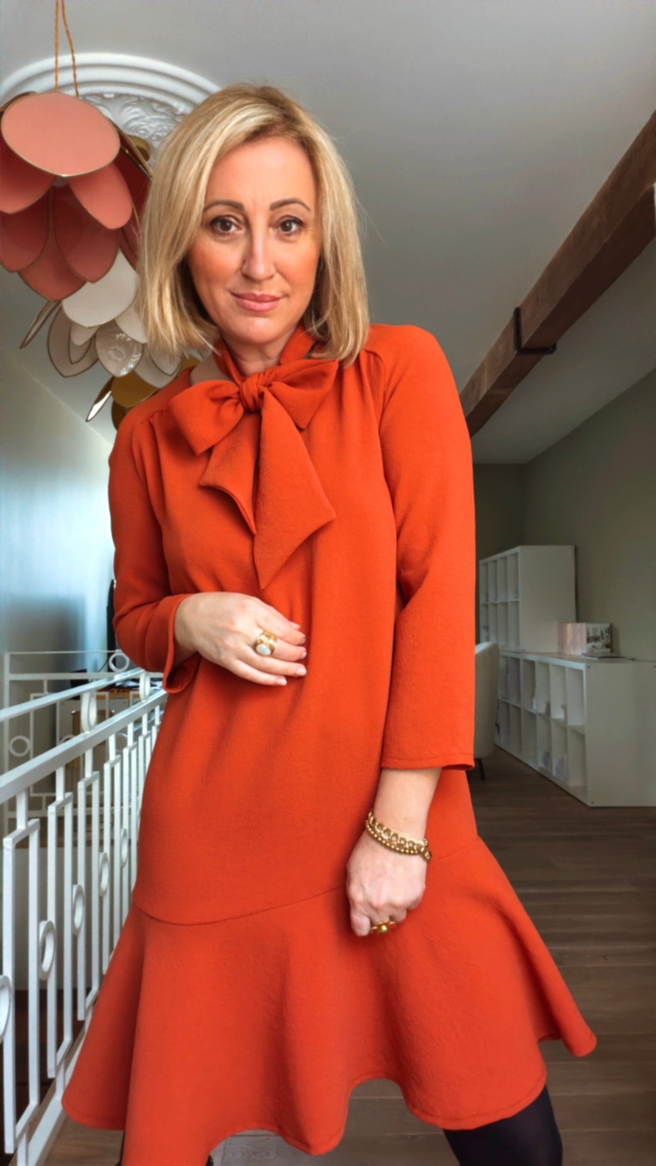 Estelle mesure 1m60 et porte la robe LOULOU en taille 36 pour son 34/36 du vêtement en prêt-à-porter du commerce.