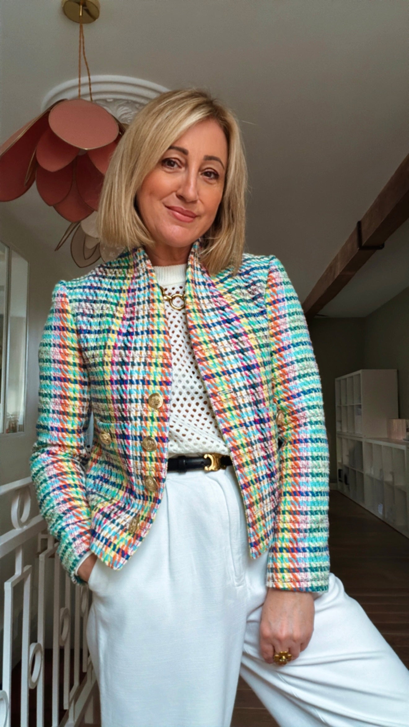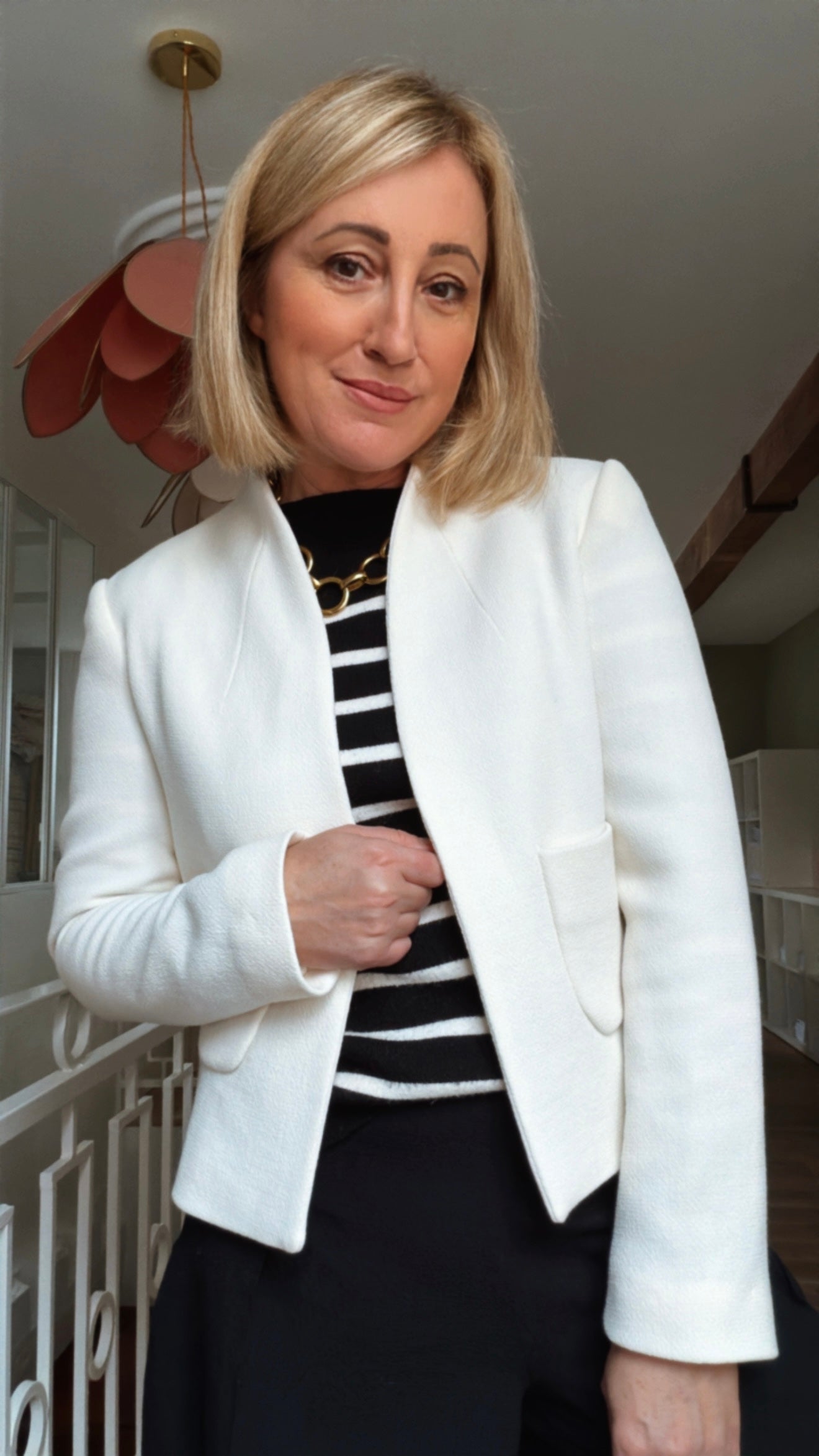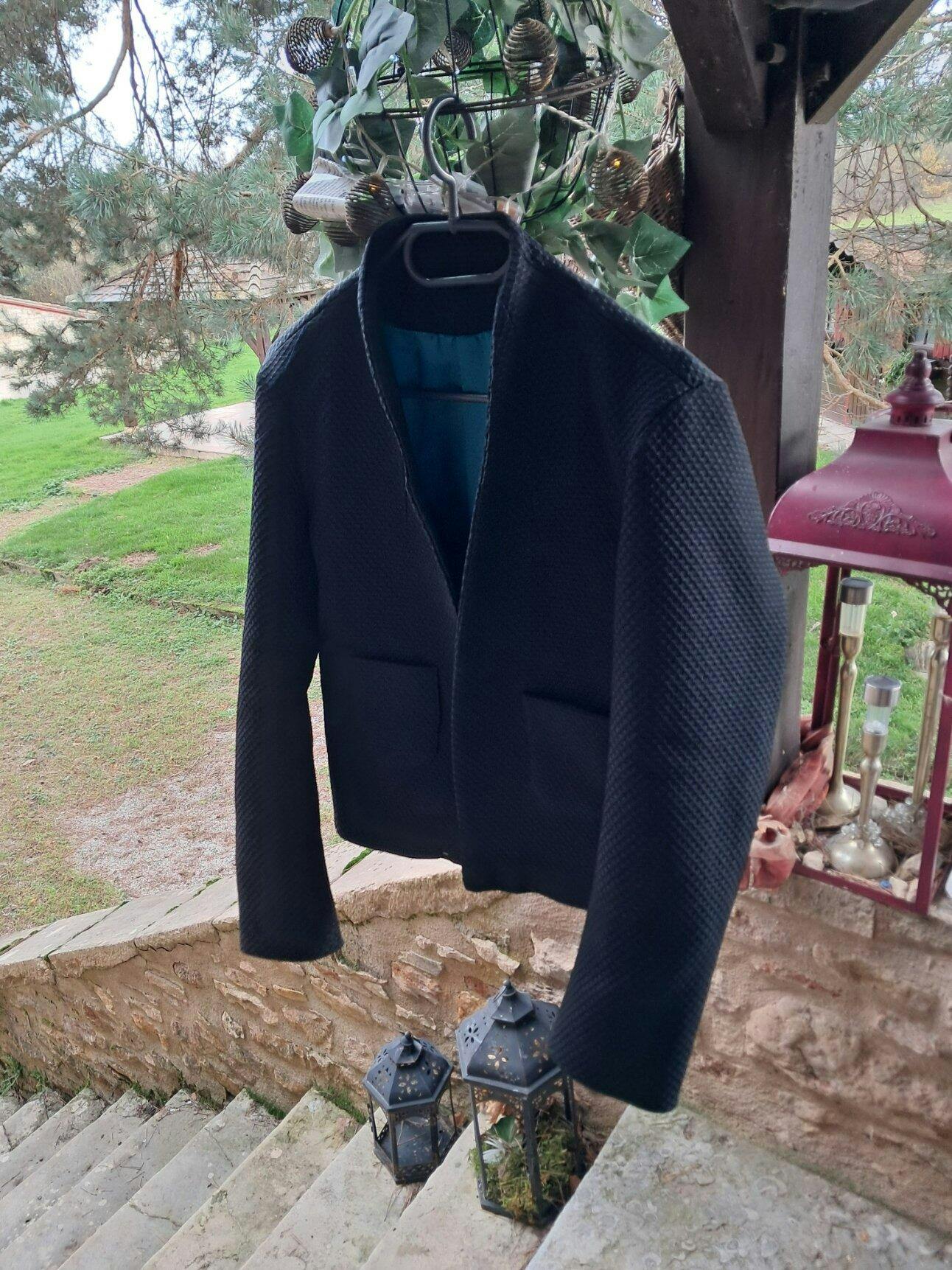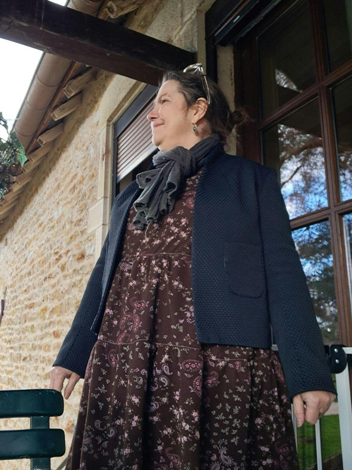 Estelle mesure 1m60 et porte la veste CHLOÉ en taille 36 pour son 34/36 du vêtement en prêt-à-porter du commerce.