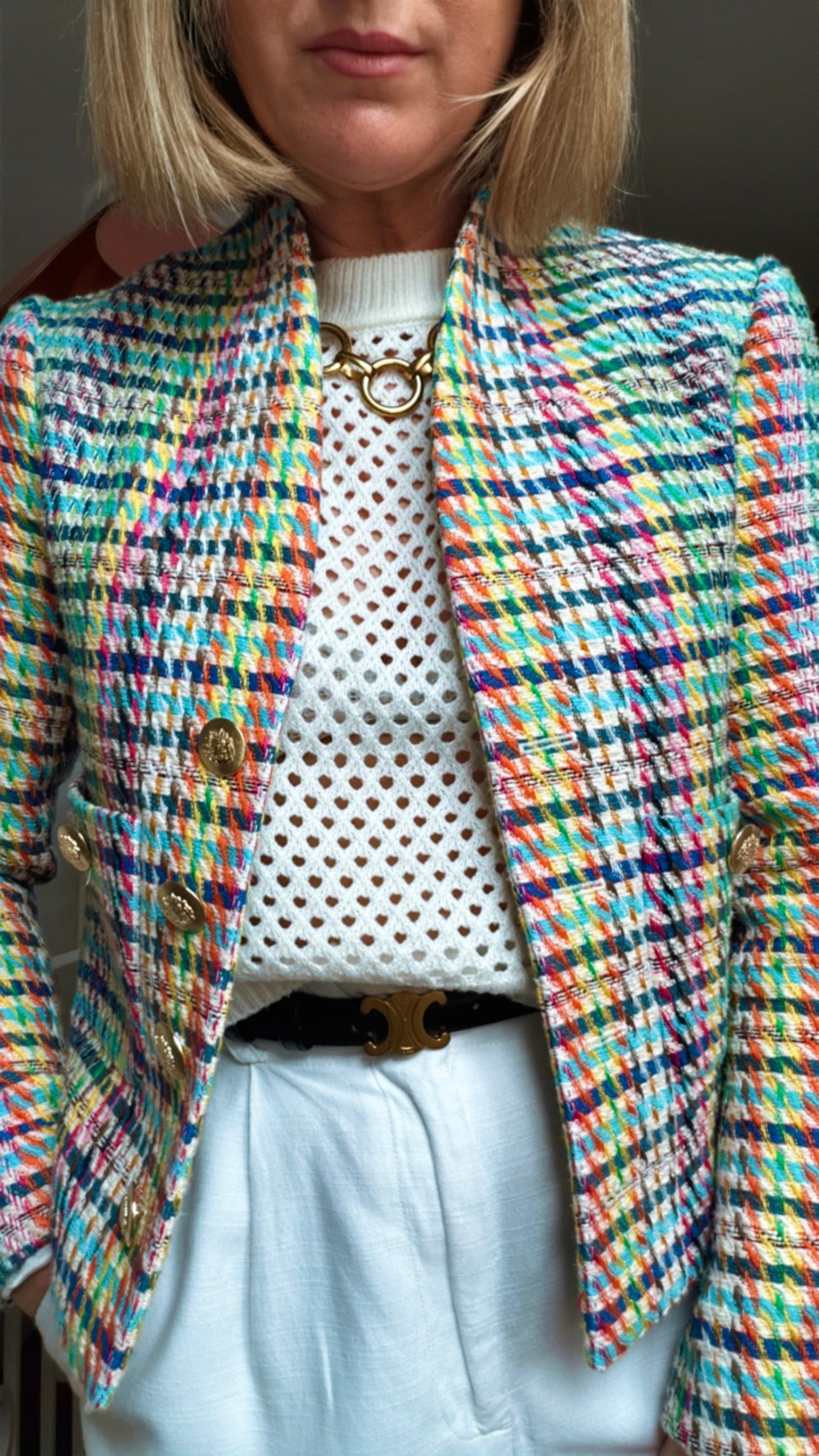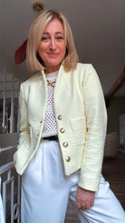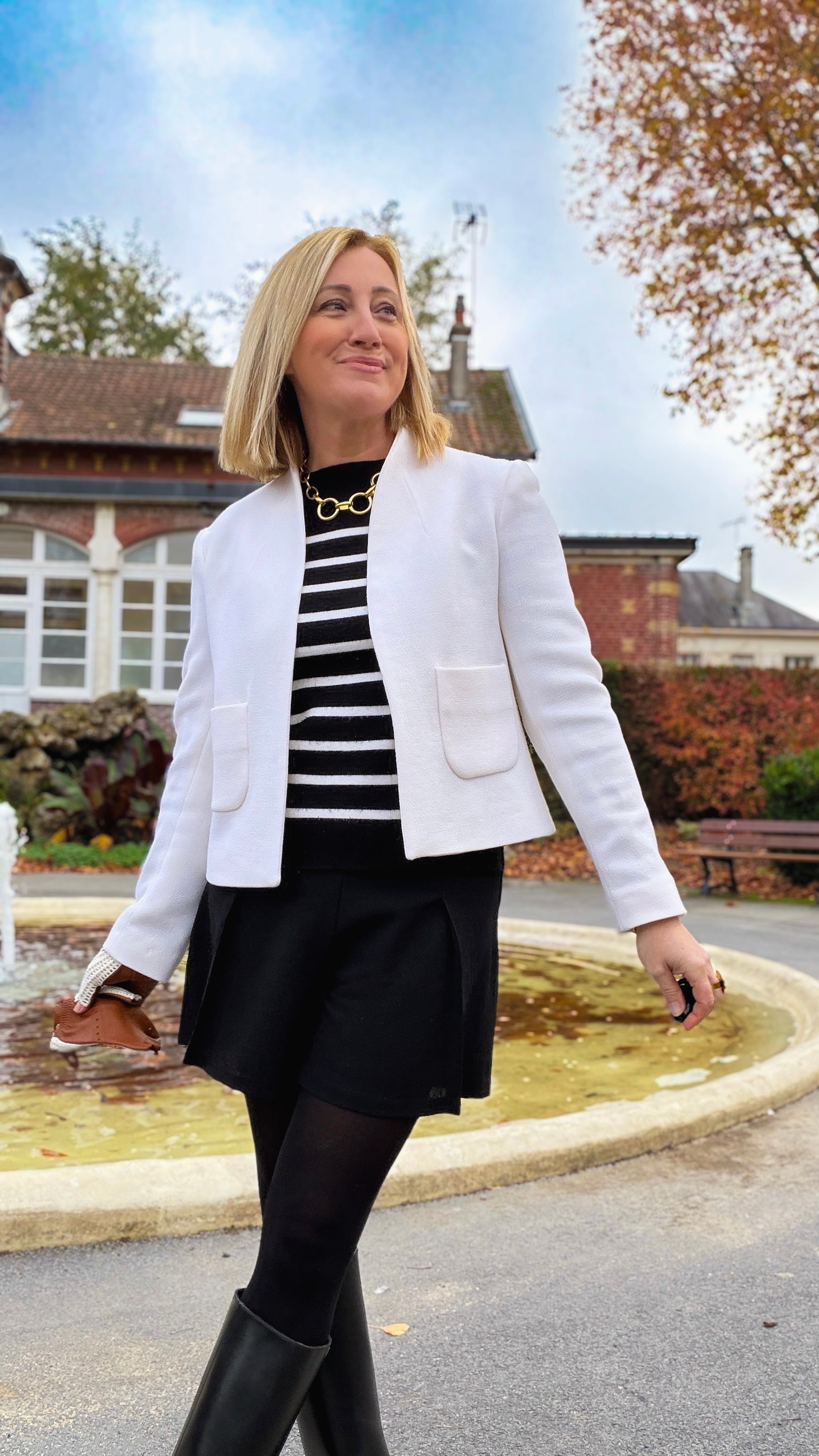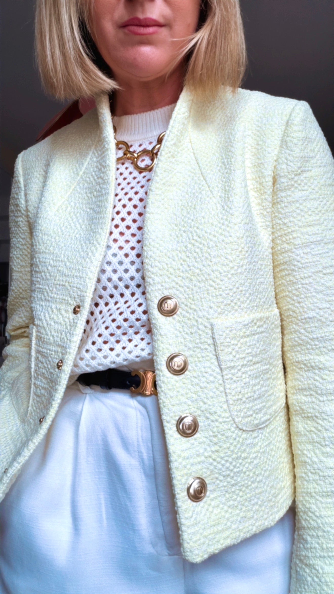 Estelle mesure 1m60 et porte la veste CHLOÉ en taille 36 pour son 34/36 du vêtement en prêt-à-porter du commerce.