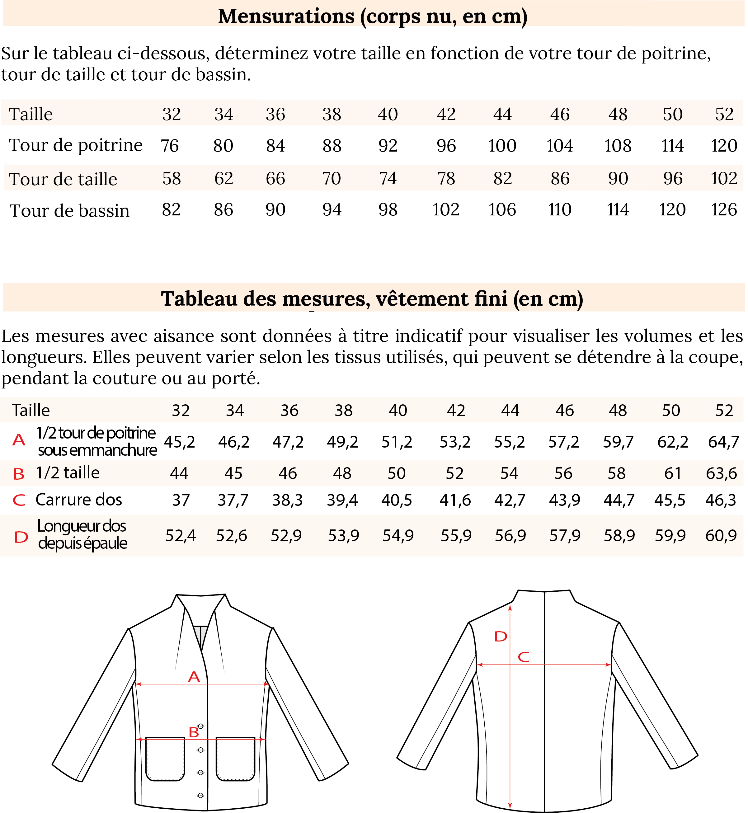 Le patron de couture de la veste CHLOÉ est proposé de la taille 32 à 52 pour une stature de 1m65.