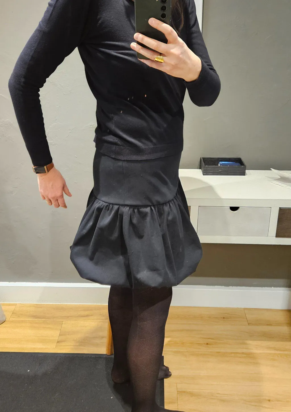 Estelle mesure 1m60 et porte la jupe boule BABOOSHKA en taille 34 pour son 34/36 du vêtement en prêt-à-porter du commerce.