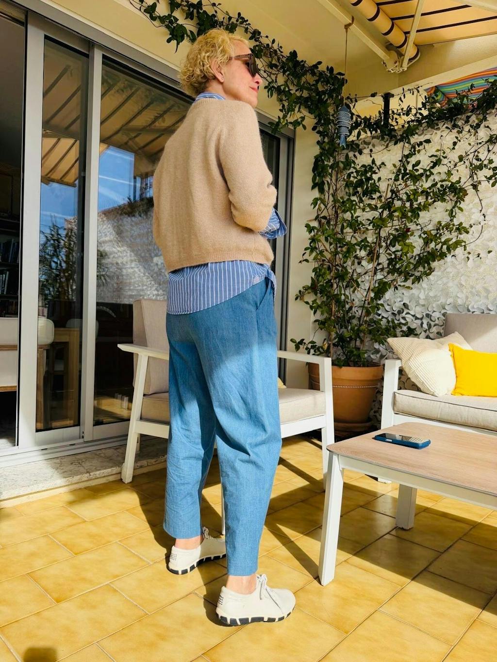 Estelle mesure 1m60, tour de taille 72 cm, tour de bassin 92 cm et porte le pantalon LAZAZO en taille 36 pour son 34/36 du vêtement en prêt-à-porter du commerce.