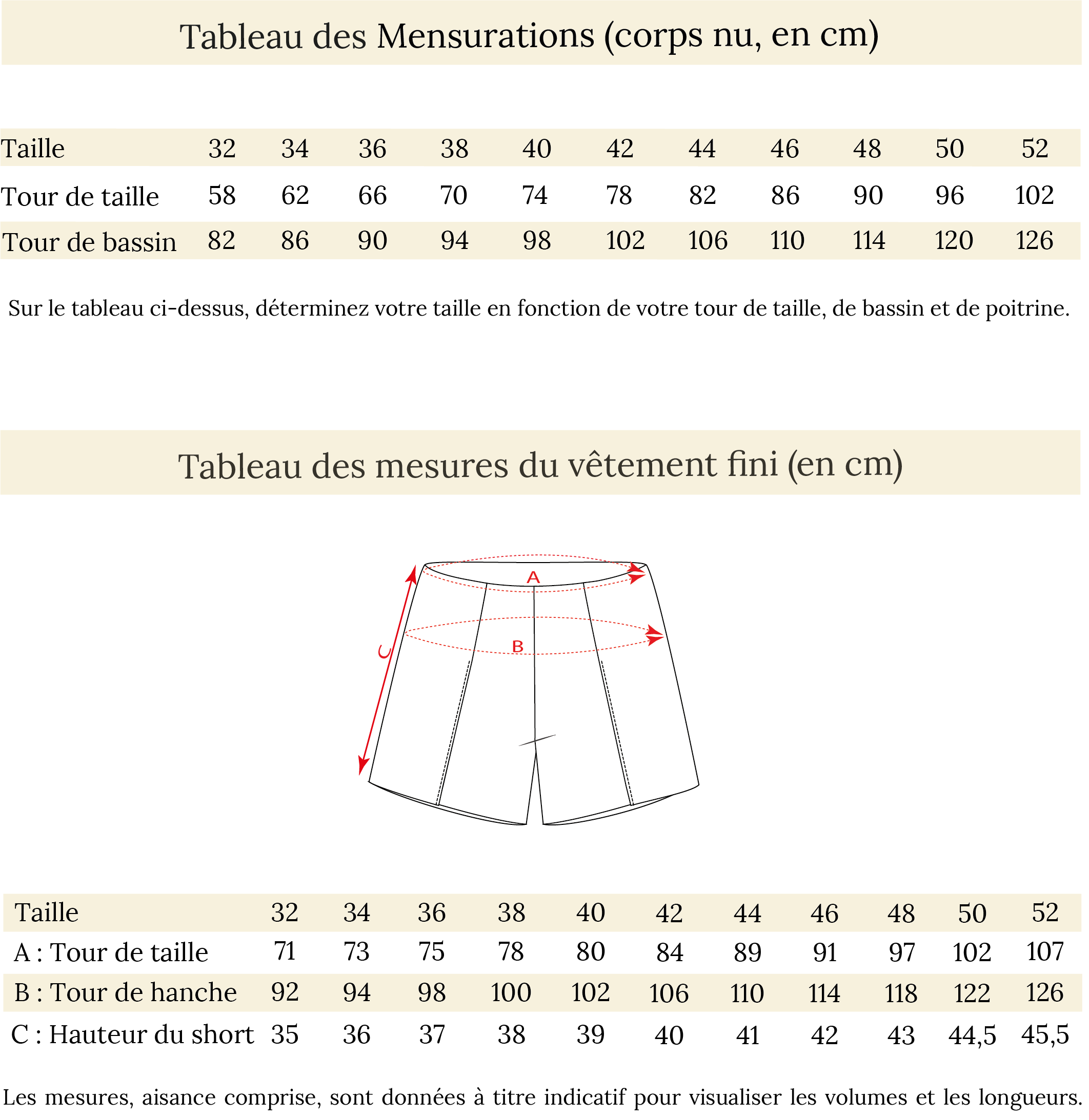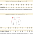 Tableau des mensurattions et des mesures du vêtement fini