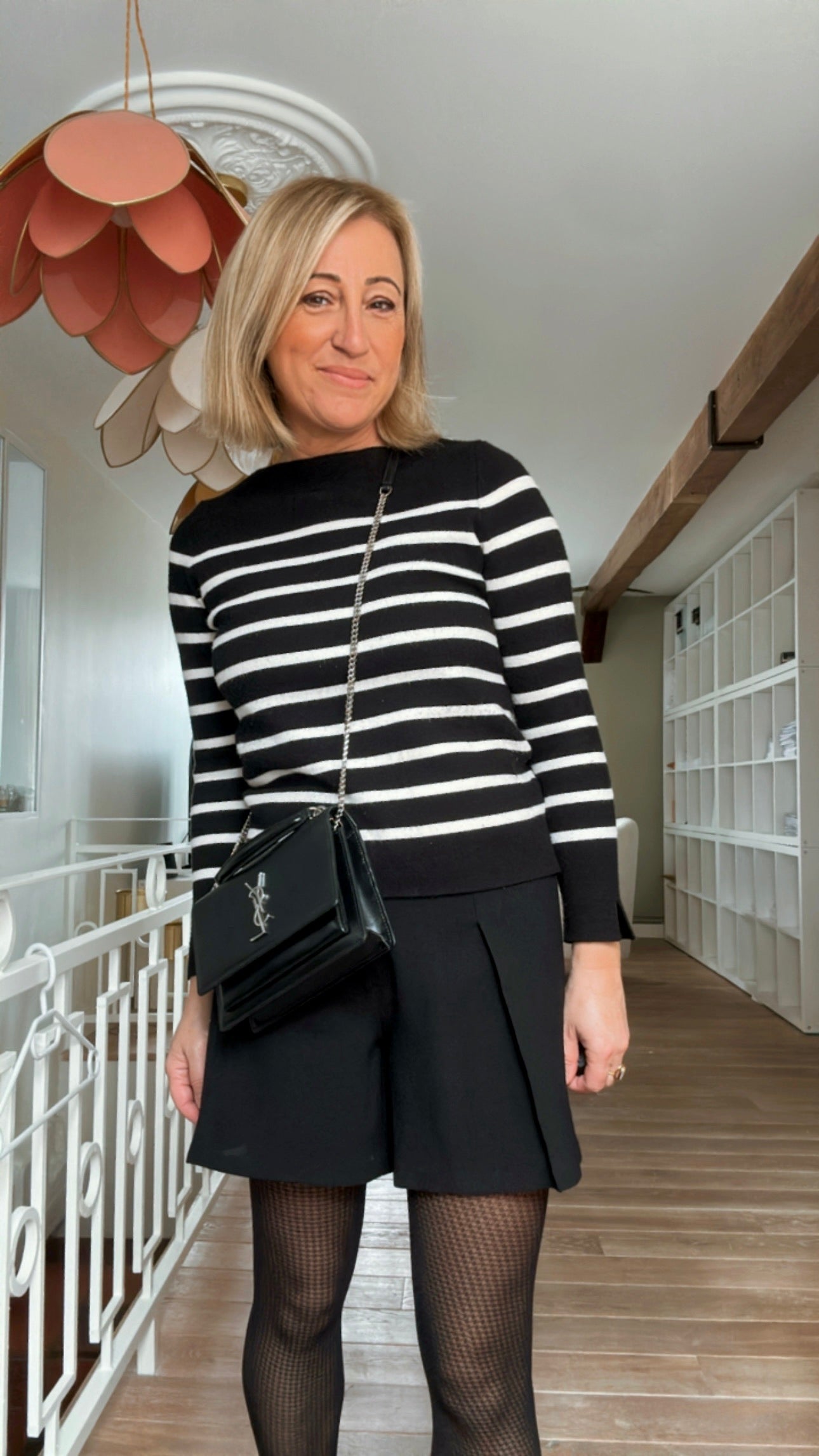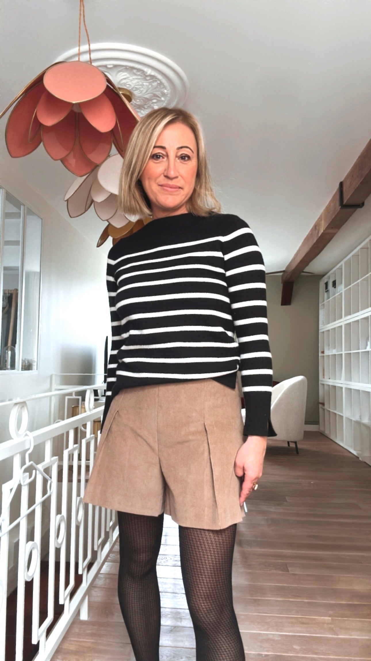 Estelle mesure 1m60 et porte le short PAOLA en taille 36 pour son 34/36 du vêtement en prêt-à-porter du commerce.