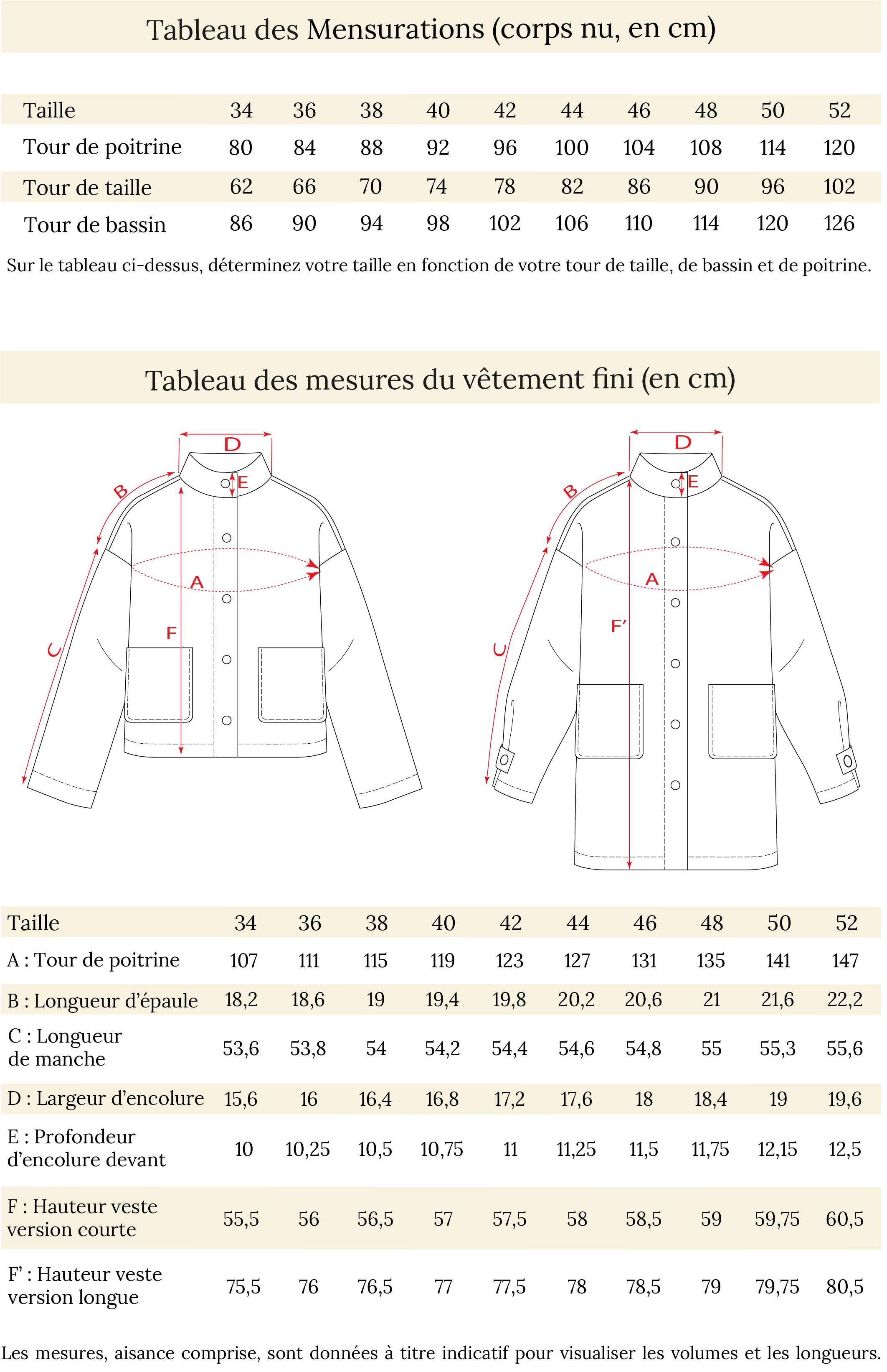 Le patron de couture de la veste OPHÉLIA est proposé de la taille 34 à 52 pour une stature de 1m65.