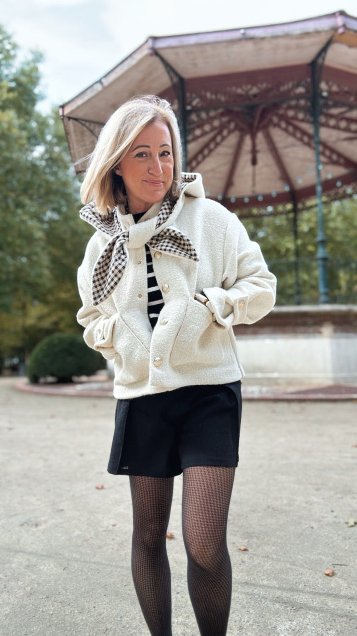 Estelle mesure 1m60 et porte la veste OPHÉLIA en taille 36 pour son 34/36 du vêtement en prêt-à-porter du commerce.